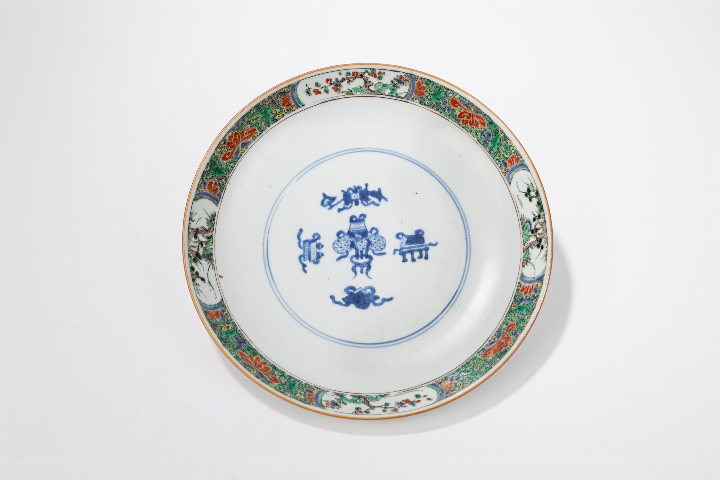 d cm 27 Cina, periodo Kangxi (1661-1722) Decorato in blu sotto coperta al centro all'interno di un doppio cerchio con oggetti antichi, il bordo è ben dipinto in verde, rosso, giallo e blu sopra coperta con motivi floreali e quattro riserve all'interno delle quali sono raffigurati alberi e rocce.