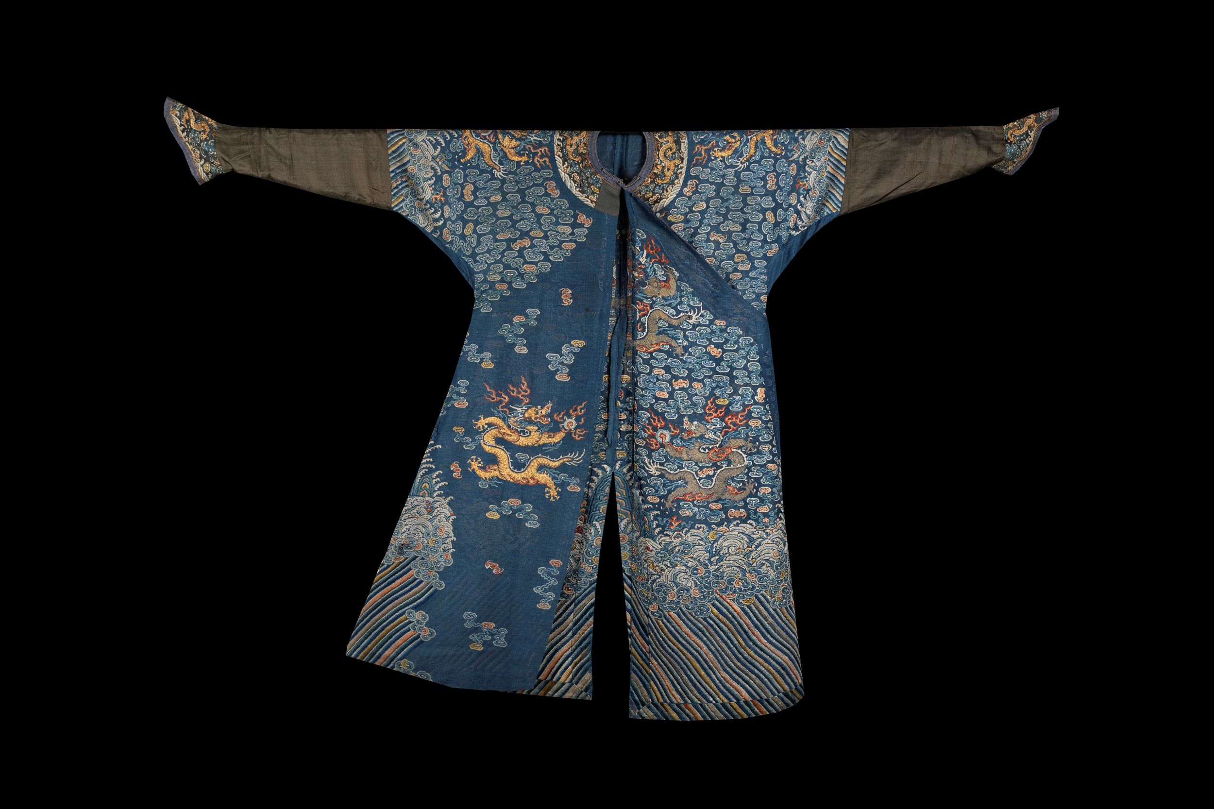 h cm 140 x l cm 210 Cina, dinastia Qing, XIX secolo Il broccato blu è finemente ricamato con filo d'oro con i consueti nove draghi a cinque artigli, due dei quali sono raffigurati a pieno viso in posizione frontale mentre saltano intorno a una perla fiammeggiante sul davanti e sul retro, mentre altri sei sul davanti, sul retro e sulle spalle sono raffigurati mentre raggiungono la perla, così come il nono sul risvolto interno. Tutti i draghi sono incastonati tra nuvole, lingzhi  e pipistrelli sotto a onde tra le quali scorrono bajixian; i polsini e il colletto sono decorati sempre con draghi e nuvole.Provenienza: da una collezione privata europea.