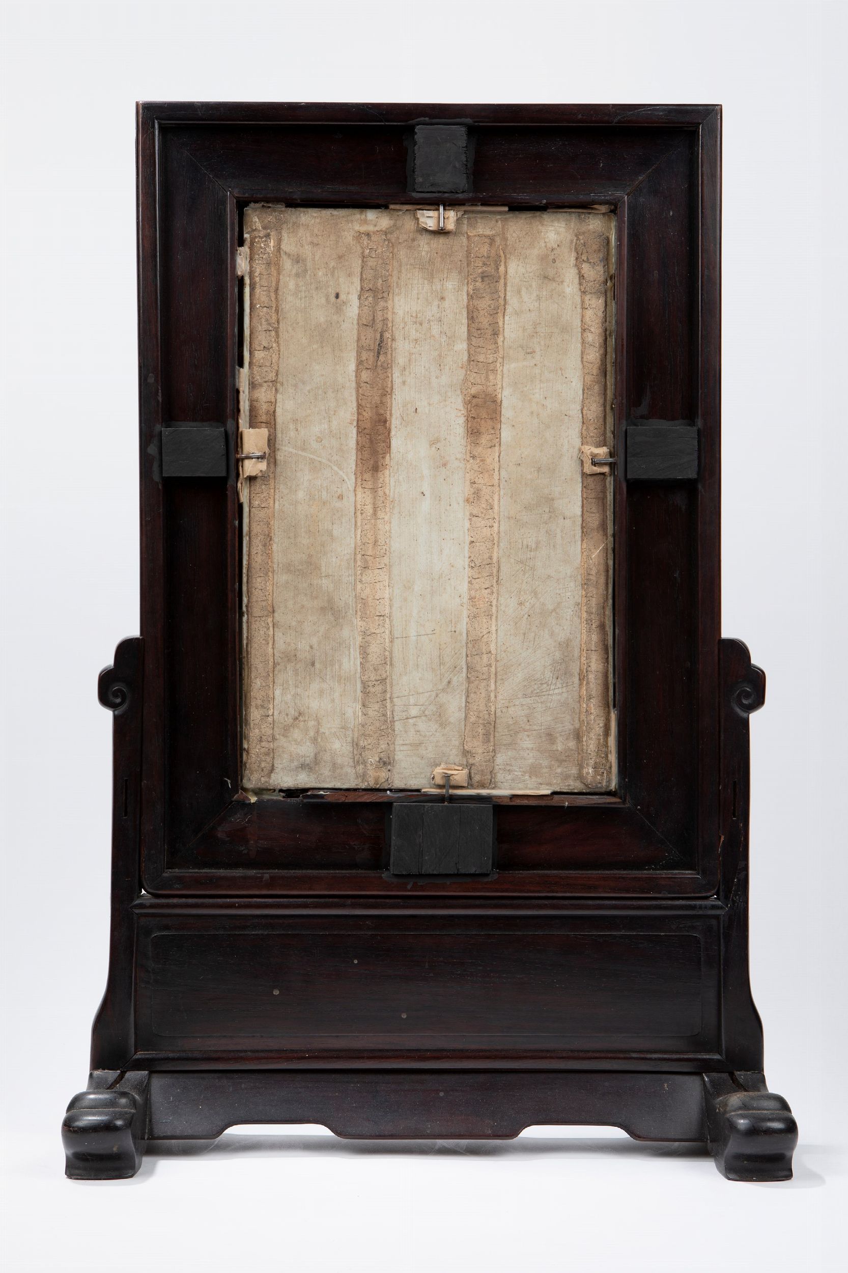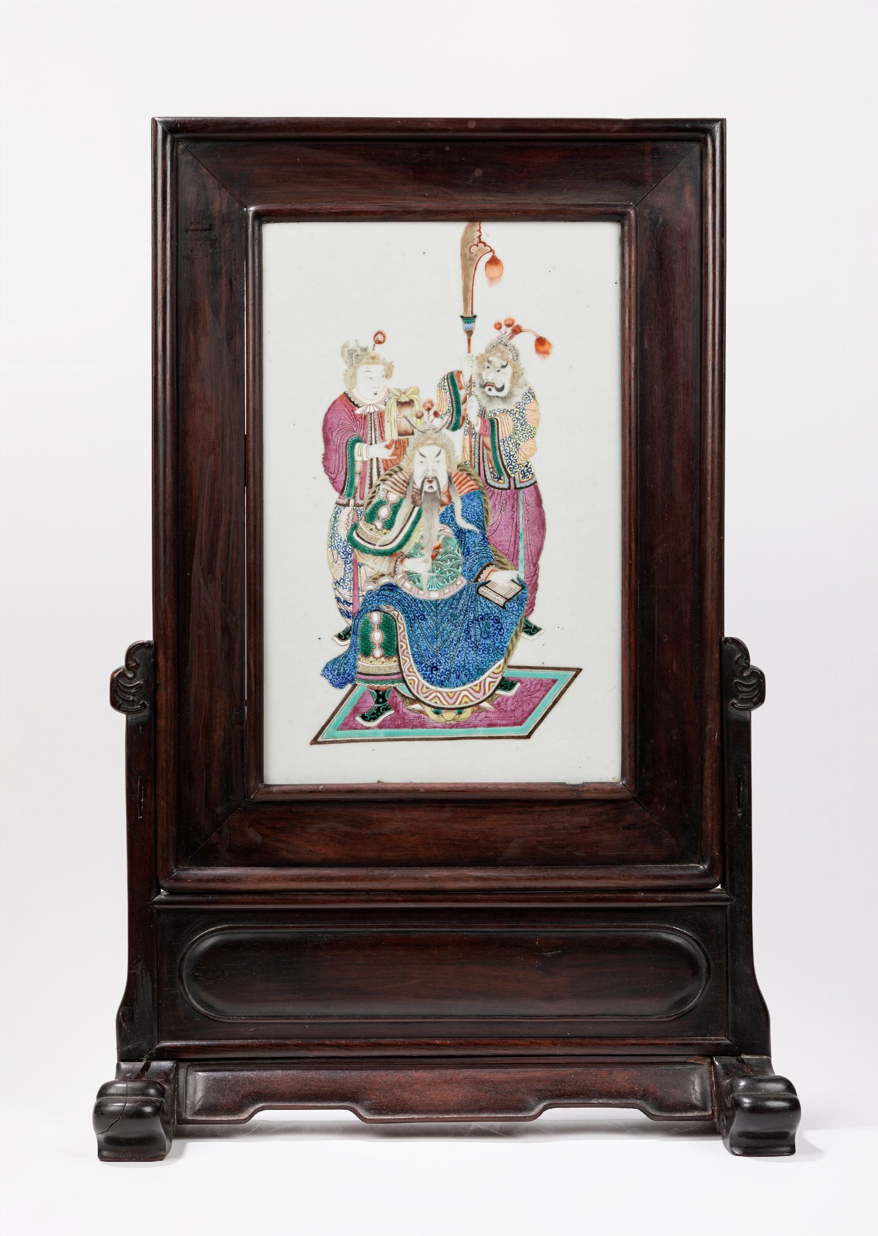 Cina, fine XIX / inizio XX secolo La placca è ben dipinta nei colori della famiglia rosa con un dignitario e due attendenti; la cornice e il supporto sono in legno.