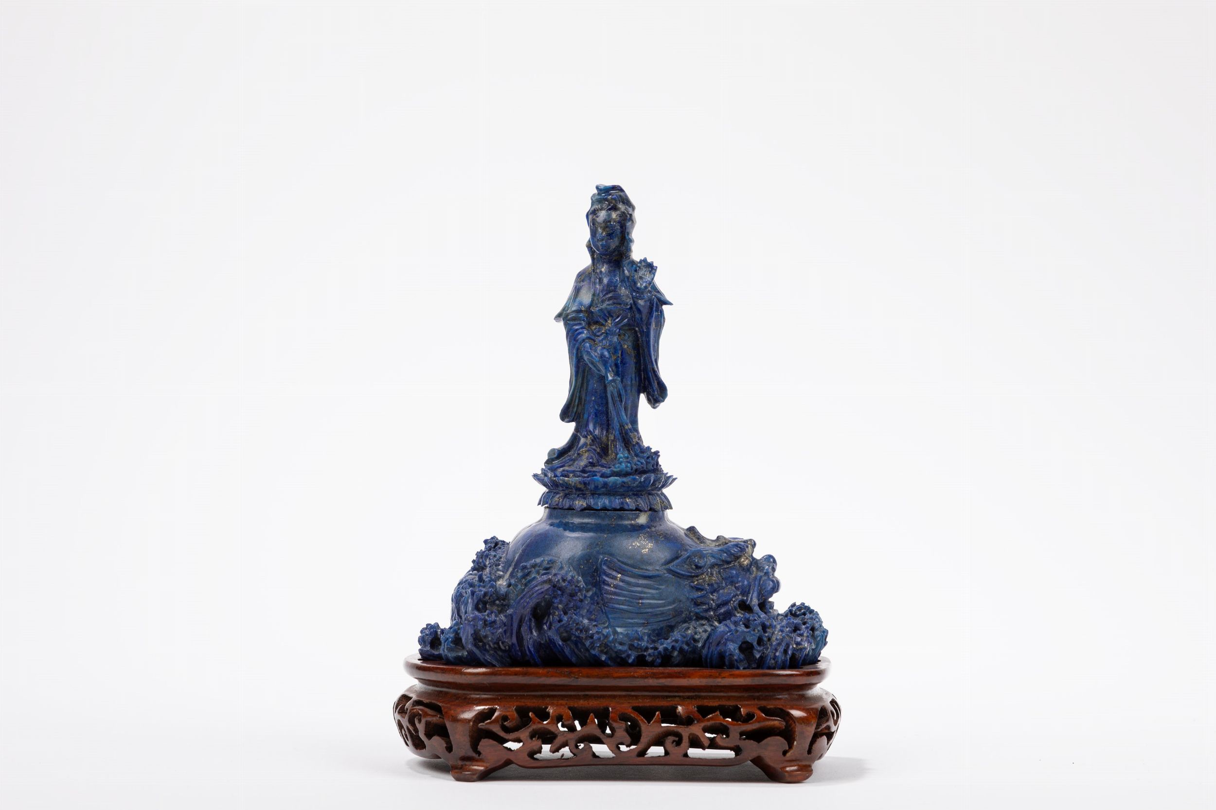 Cina, XX secolo Scolpita a forma di guanyin su mostro marino tra le onde; con la sua base in legno.