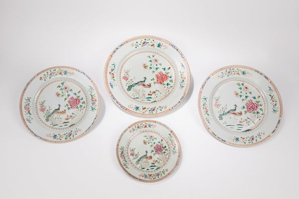 Cina, periodo Qianlong (1735-1796) Raffiguranti al centro un pavoNe e un fagiano tra peonie e rocce, sul bordo sono decorati con fiori.