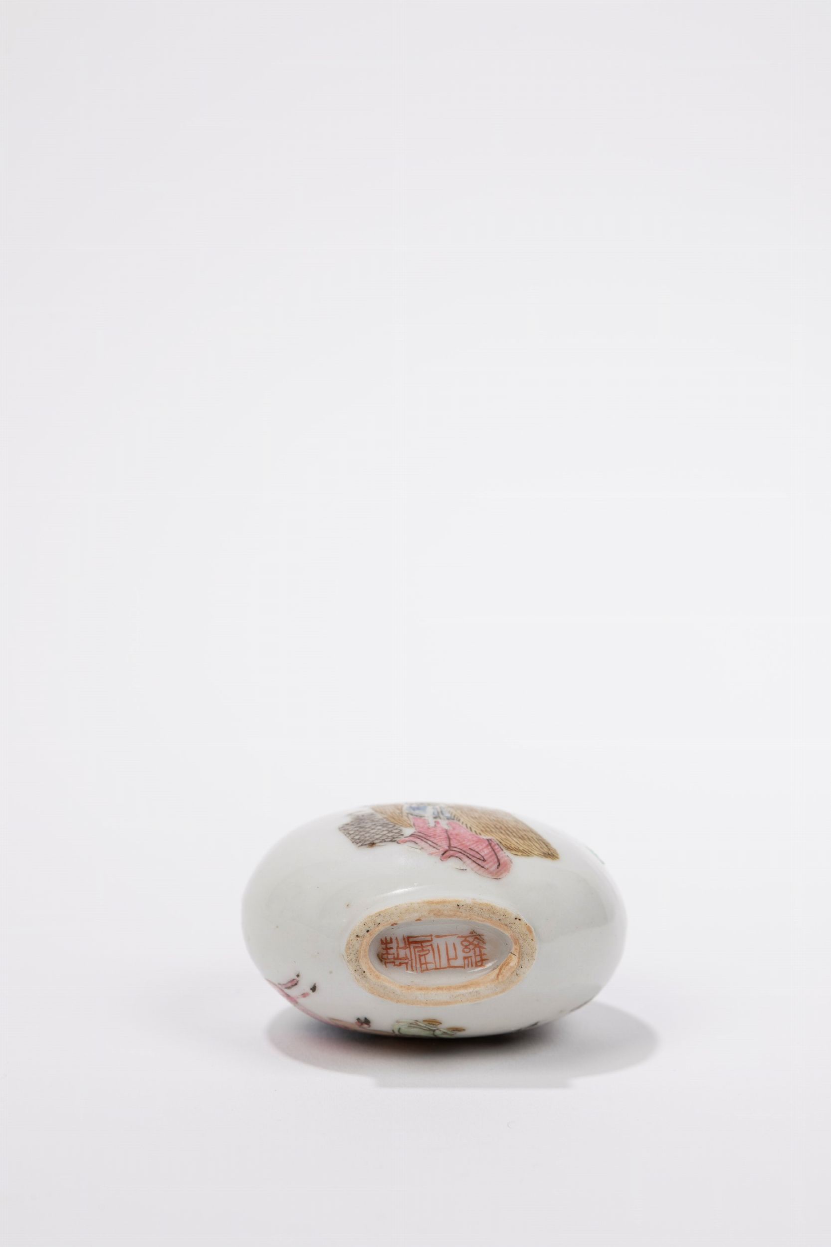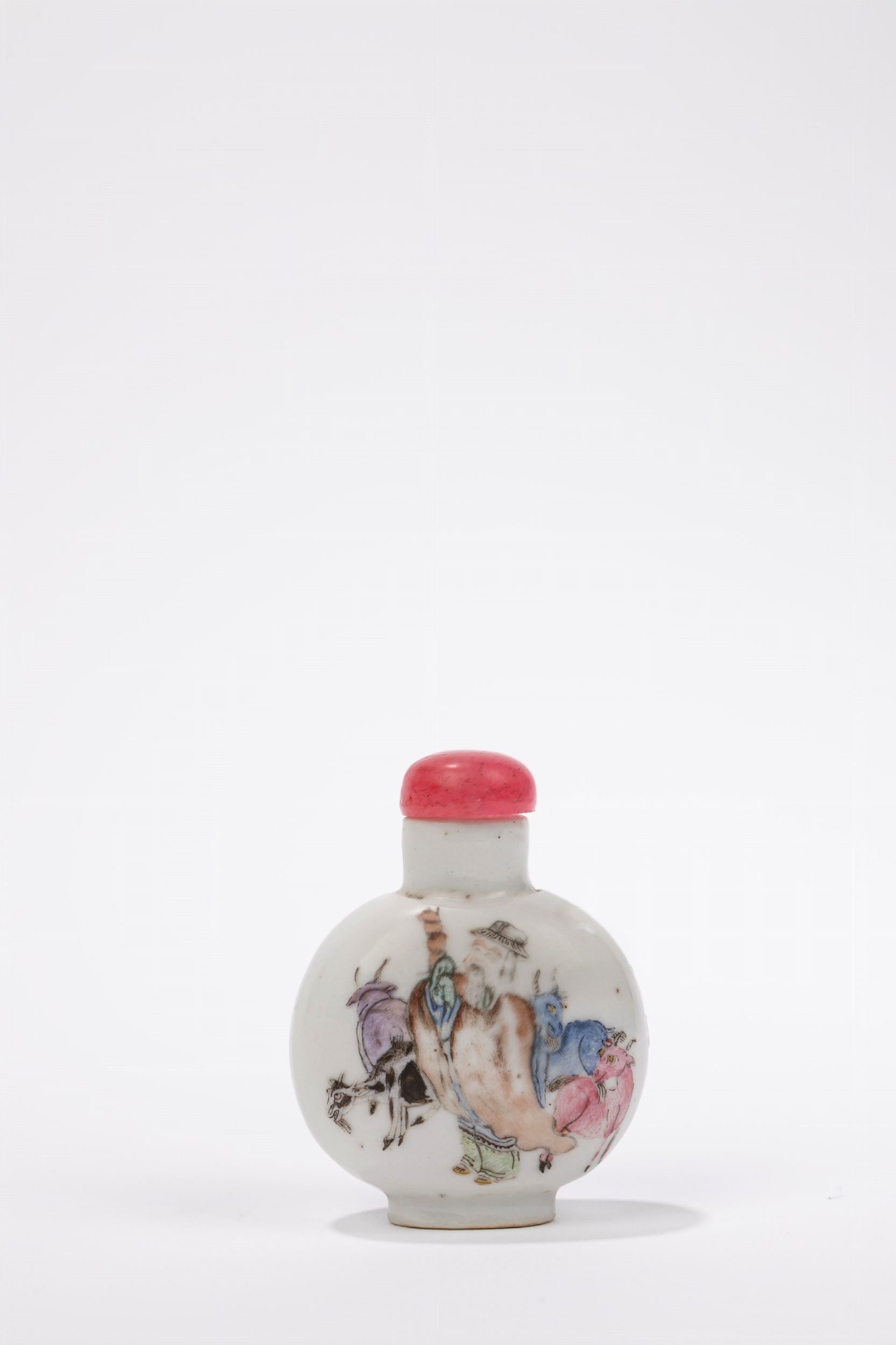 h cm 6,5 Cina, dinastia Qing, XIX secolo Decorata su un lato con un personaggio con capre e dall'altro con un saggio; al centro della base reca il marchio apocrifo a quattro carattere in rosso ferro dell'Imperatore Yongzheng; il tappino in vetro rosa.