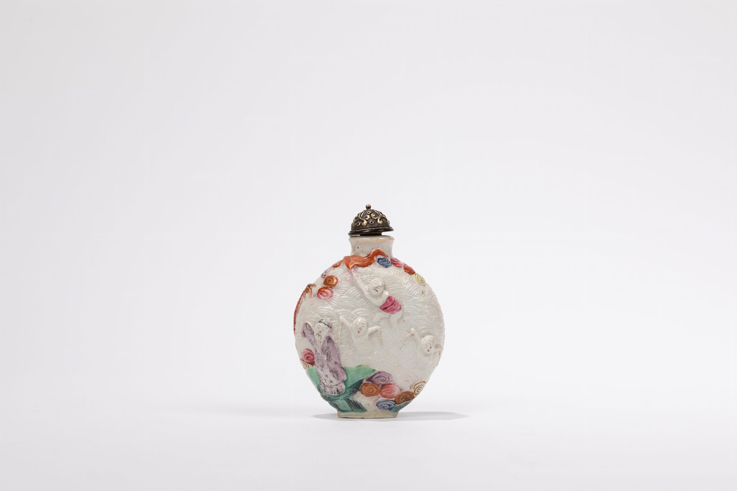 h cm 7 Cina, dinastia Qing, XIX secolo Ben modellata con una scena di personaggi e e un drago tra nuvole, rocce e onde; sulla base reca il marchio apocrifo sigillare in rosso dell'Imperatore Qianlong; il tappino in metallo.Provenienza: dalla collezione del Professor Ferdinando Cappelletti.