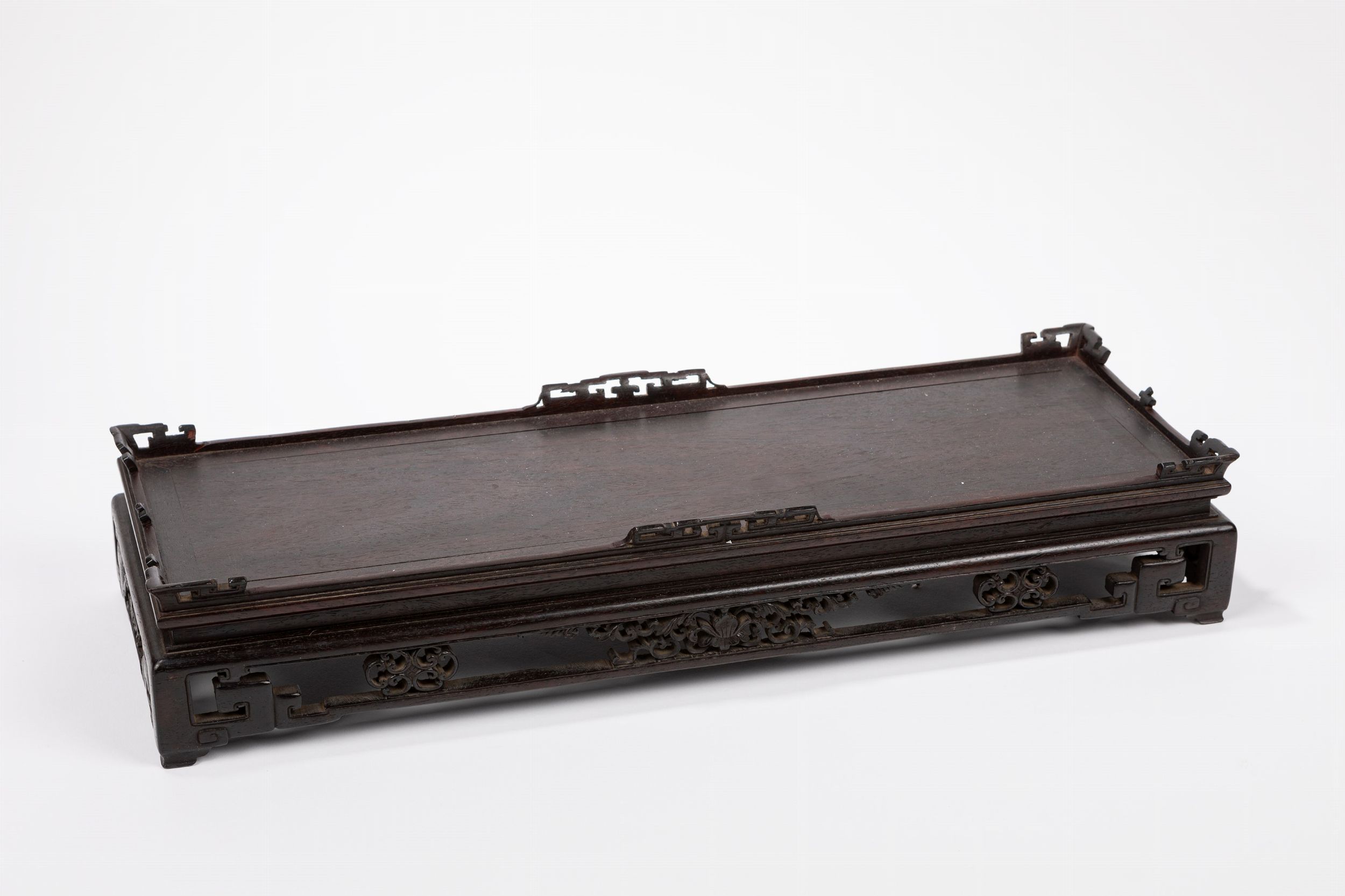 Cina, dinastia Qing, fine XVIII secolo Dalla forma rettangolare, poggia su quattro piedi intagliati a motivi di volute, sui quattro lati sono intagliati con eleganti motivi floreali.