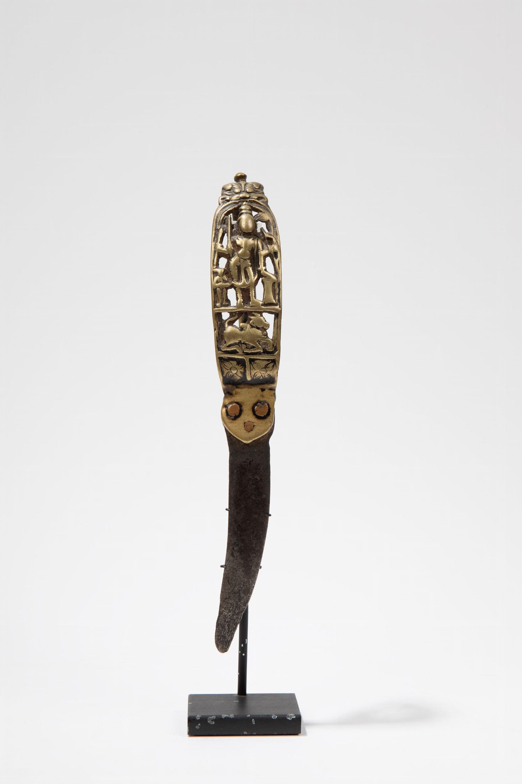 h cm 22 India, Karnataka XVII secolo La lama di ferro è applicata al manico di bronzo con due rivettini di rameche mostra la figura di Virabhadra che impugna la spada e uno scudo sopra quella di Nandi, il toro sacro a Shiva. Note di catalogo:Pubblicato su Arts of Asia, Autunno 2022, pag. 86.