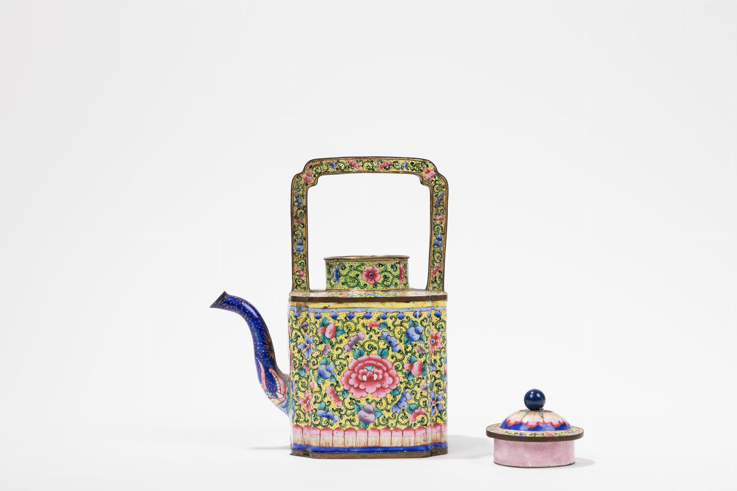h cm 14,5 Cina, dinastia Qing, XVIII secolo Di forma quadrata e lobata con presa rialzata, è decorata su fondo giallo a motivi floreali e doppie zucche su una base di petali rosa; il beccuccio dipinto in blu che esce dalle fauci di un mostro; il coperchio decorato sulla sommità con un fiore.