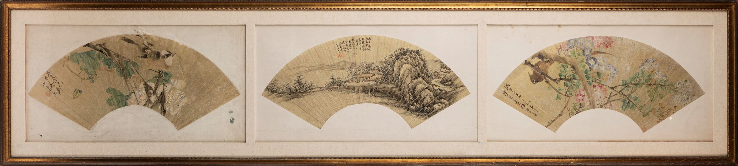 Cina, dinastia Qing, XIX secolo Tre ventagli dipinti con uccelli e fiori e un paesaggio, tutti recano iscrizioni.