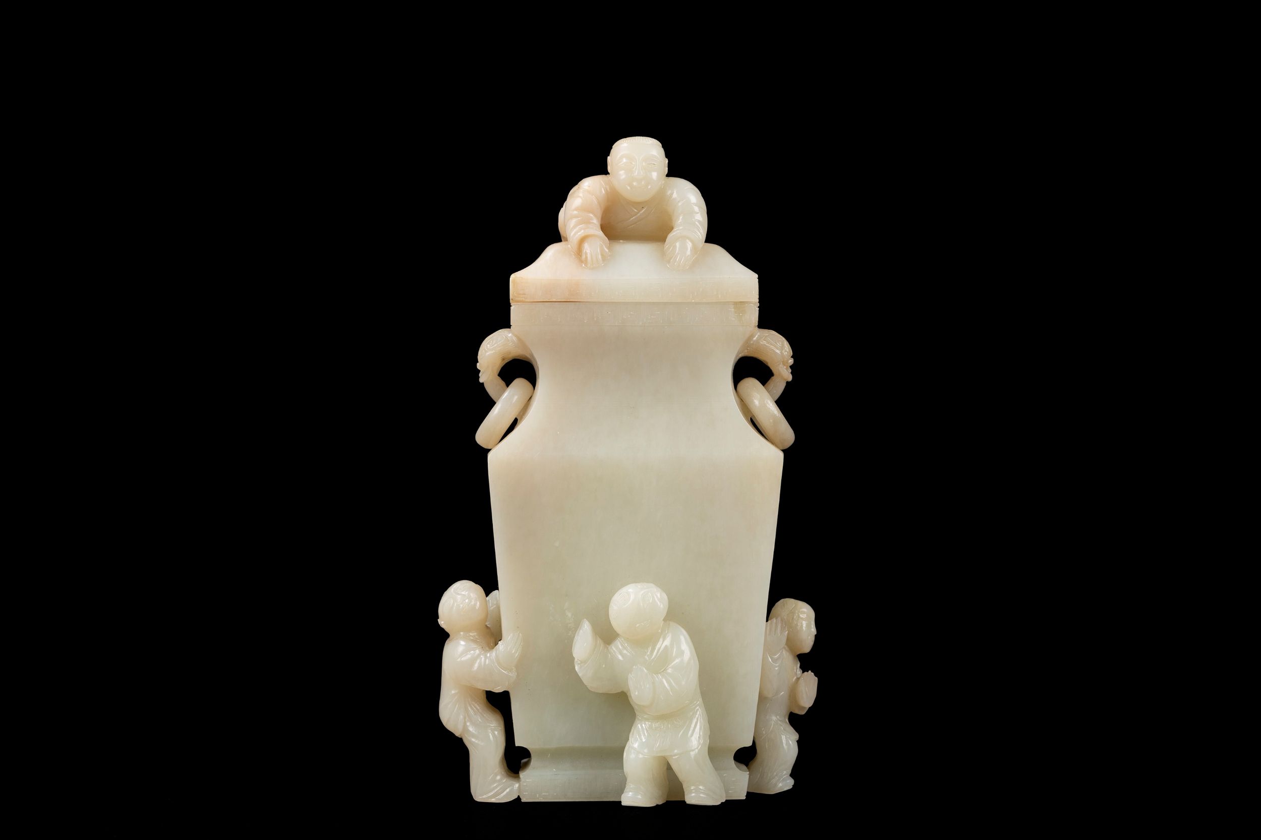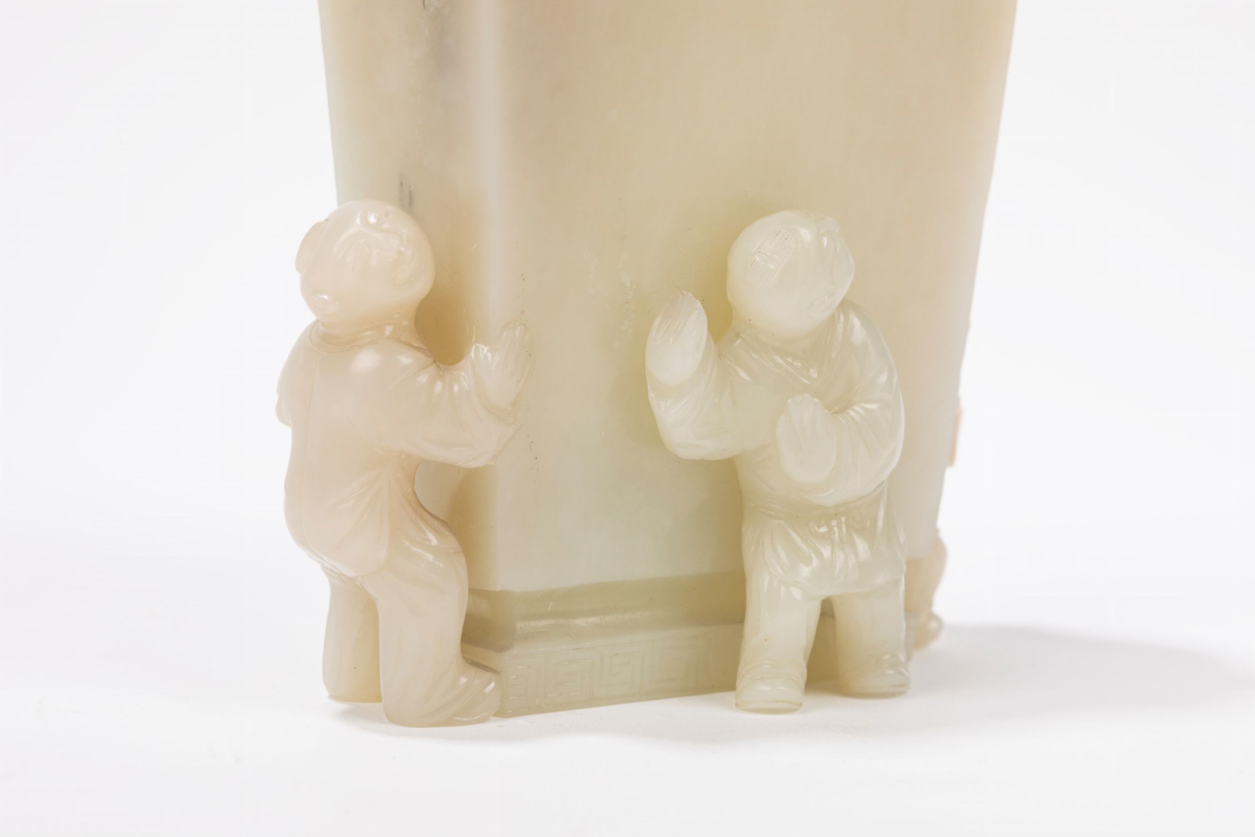 Cina, dinastia Qing, XIX secolo Il vaso a sezione quadrata presenta una coppia di anse leonine che sorreggono manici ad anello su entrambi i lati, è ben scolpito con dei ragazzi raffigurati mentre si arrampicano intorno e sopra il vaso.