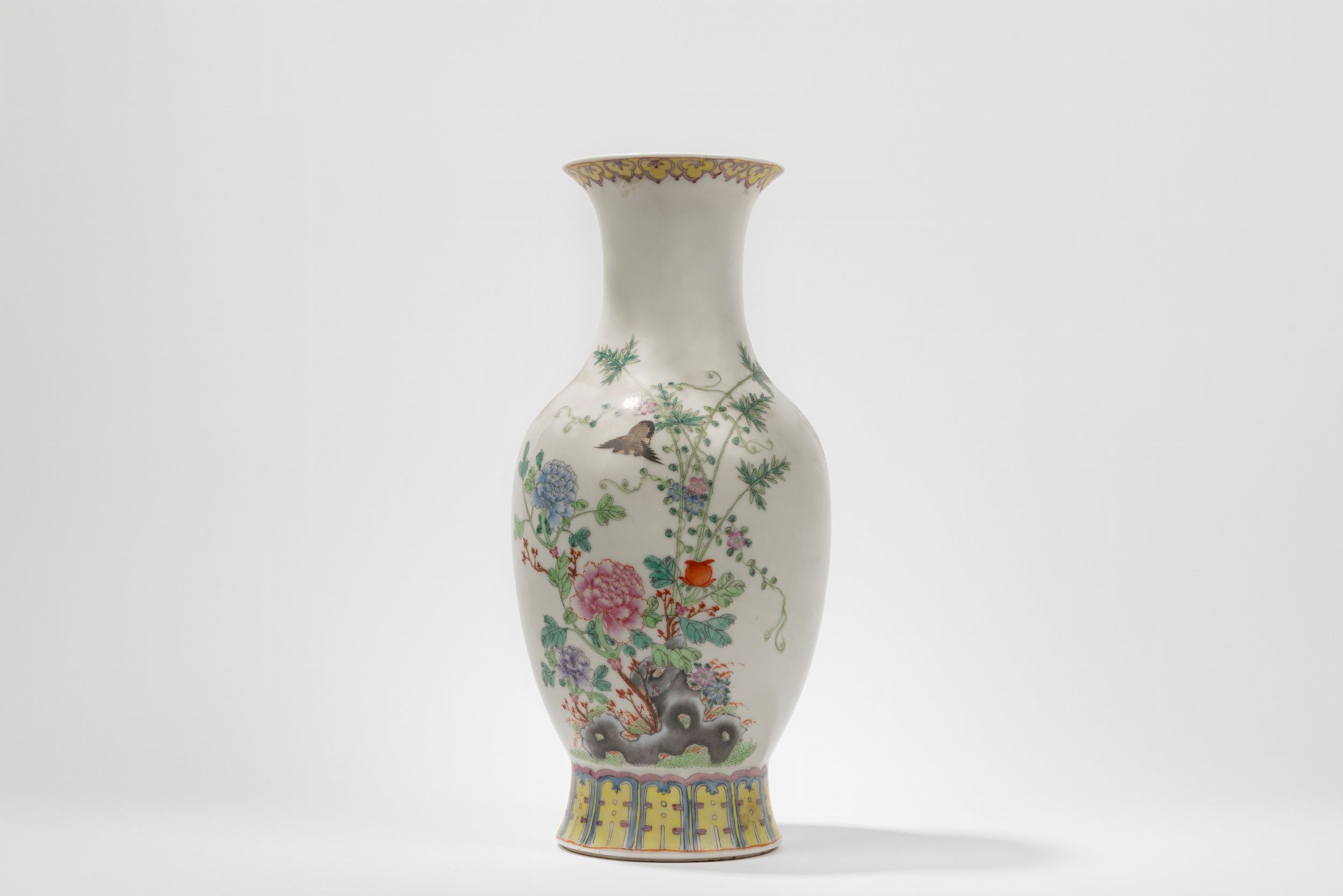 Cina, Repubblica di Cina (1912-1949) Dalla classica forma a colonna di balaustra, ben dipinto sul corpo con peonie, un uccellino e rocce; reca marchio a quattro caratteri in rosso di Hongxian.