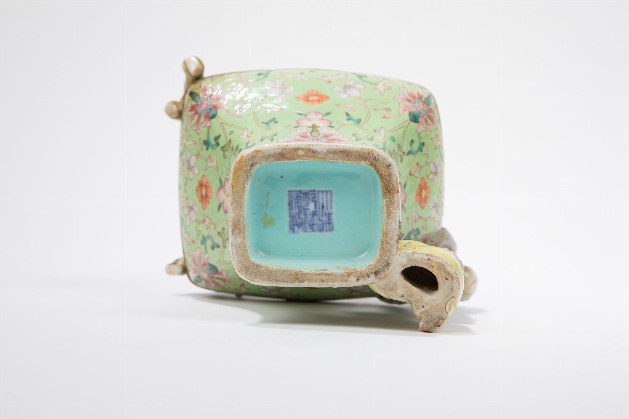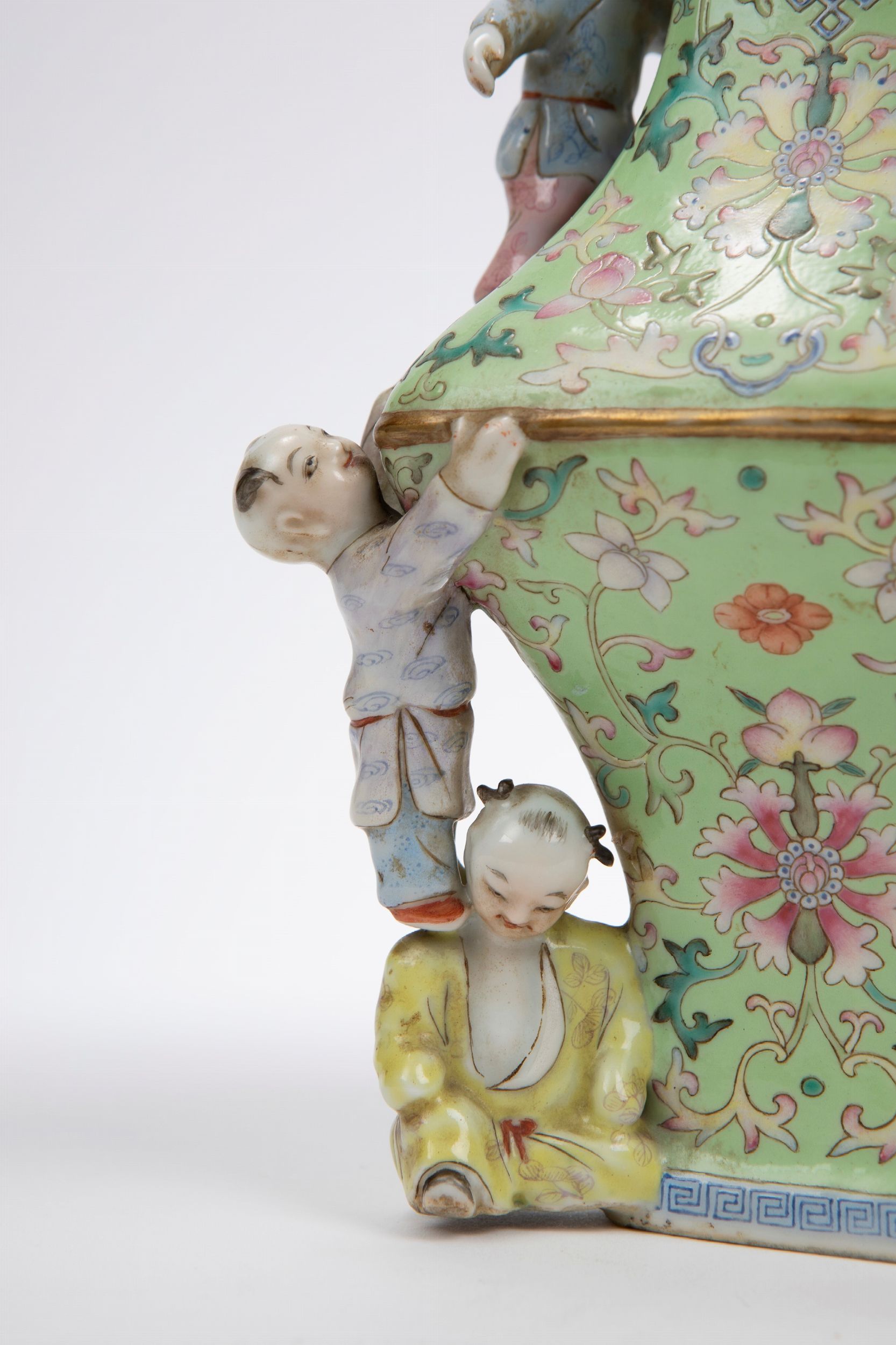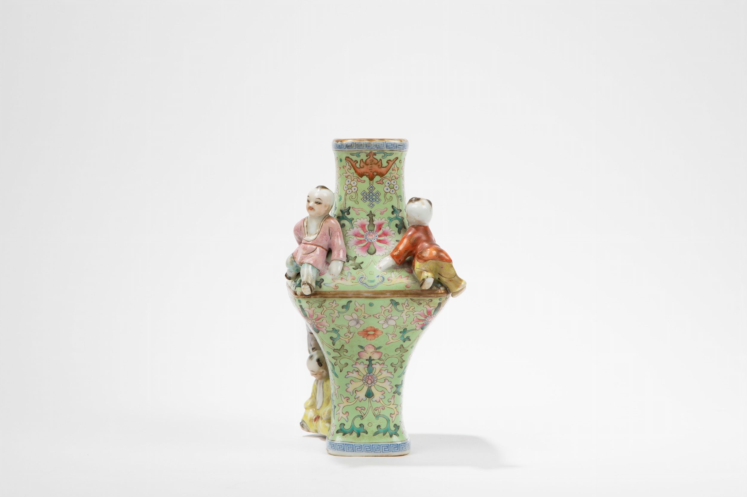 h cm 19,6 Cina, Repubblica di Cina (1912-1949) Dalla forma a colonna di balaustro quadrata, è dipinto con scroll di fiori e foglie su fondo verde lime; sul corpo si arrampicano cinque bambini che giocano; al centro della base turchese reca il marchio apocrifo sigillare a sei caratteri in blu sotto coperta dell'Imperatore Qianlong.