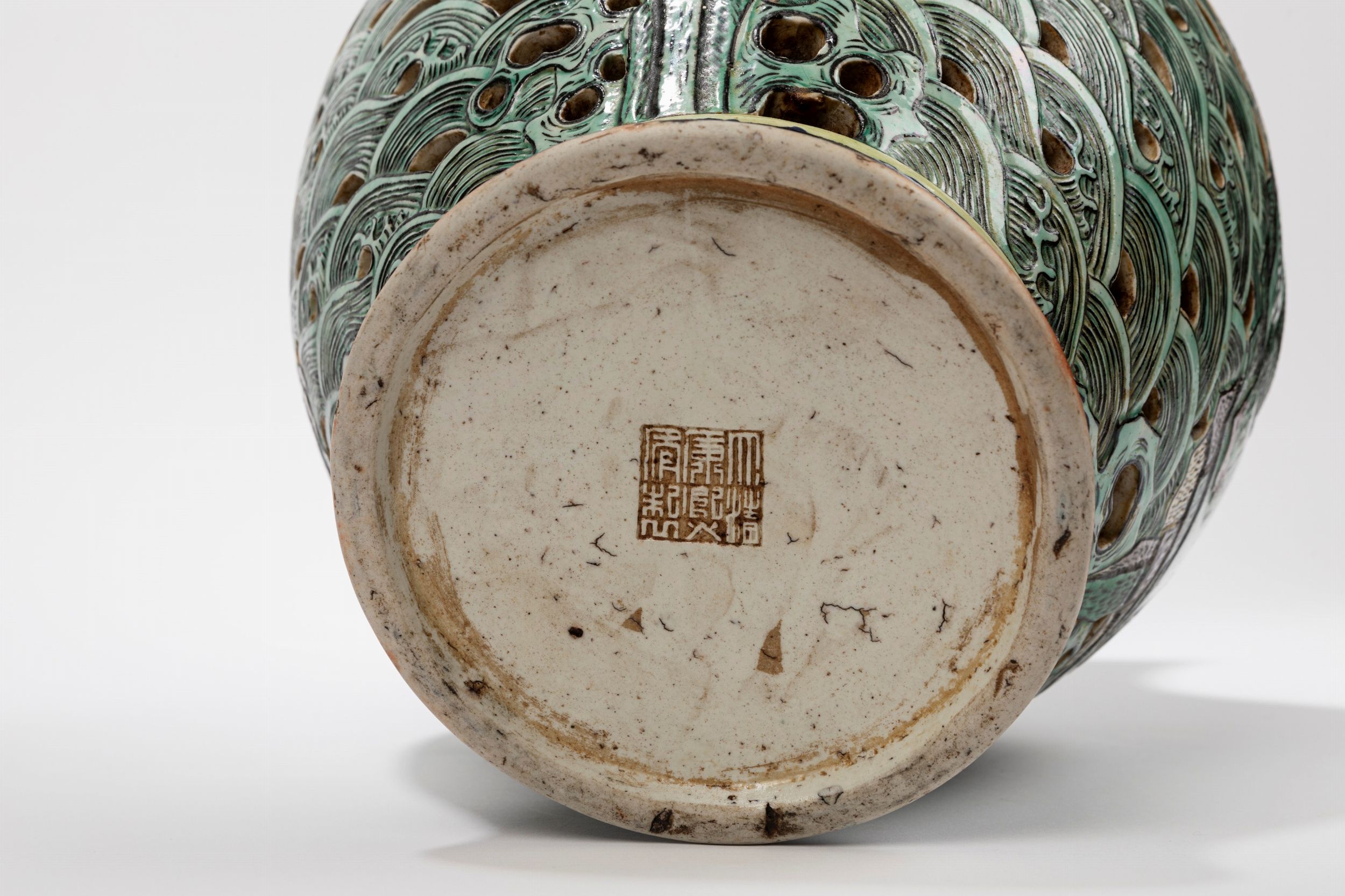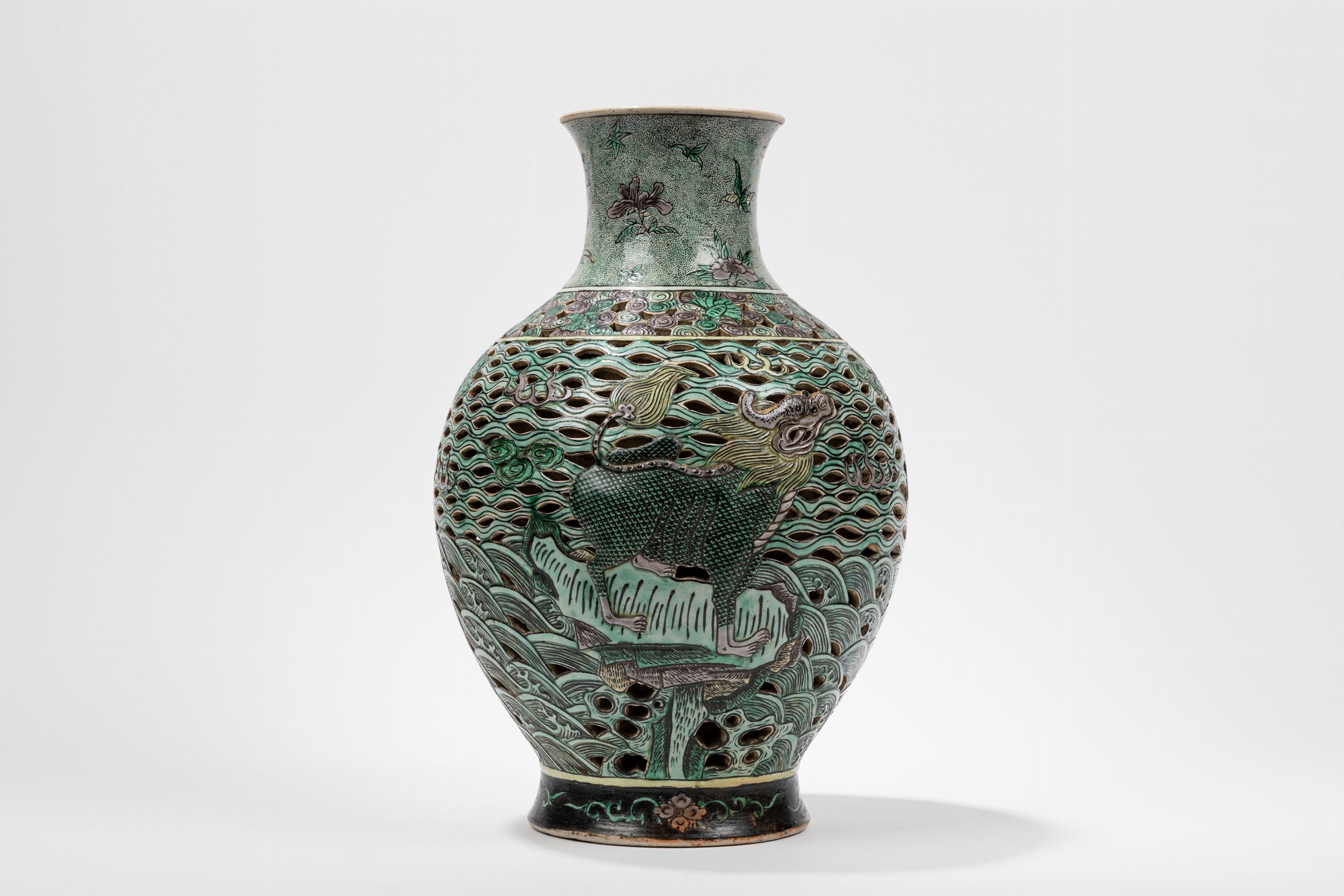 Cina, dinastia Qing, fine XIX secolo Dalla forma globulare traforata è decorato sul corpo con qilin tra onde e nuvole, il collo è decorato con motivi floreali; reca marchio a sei caratteri Kangxi.