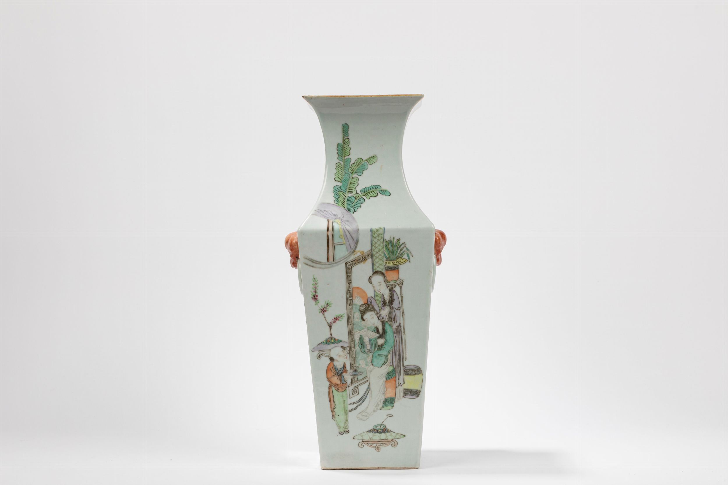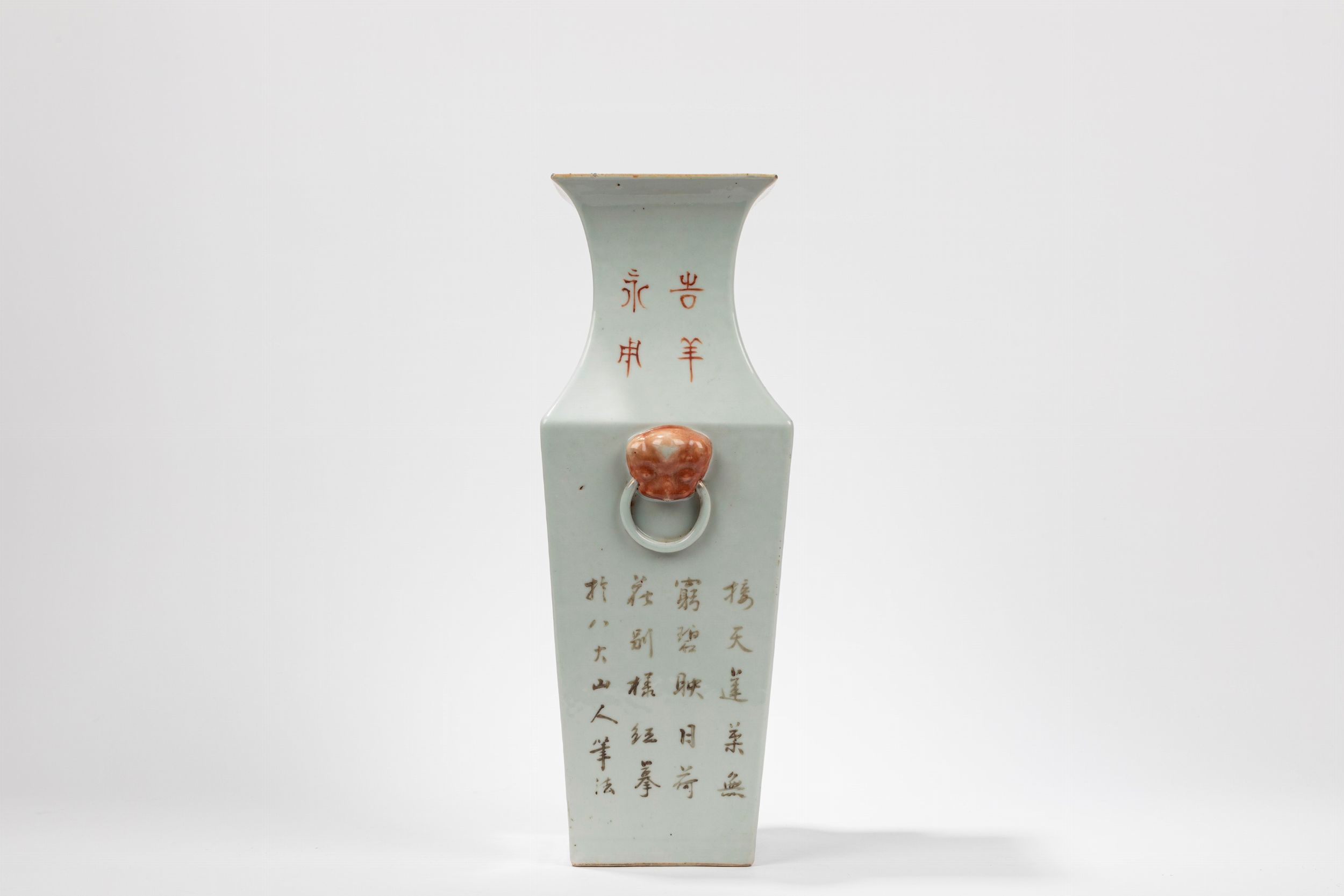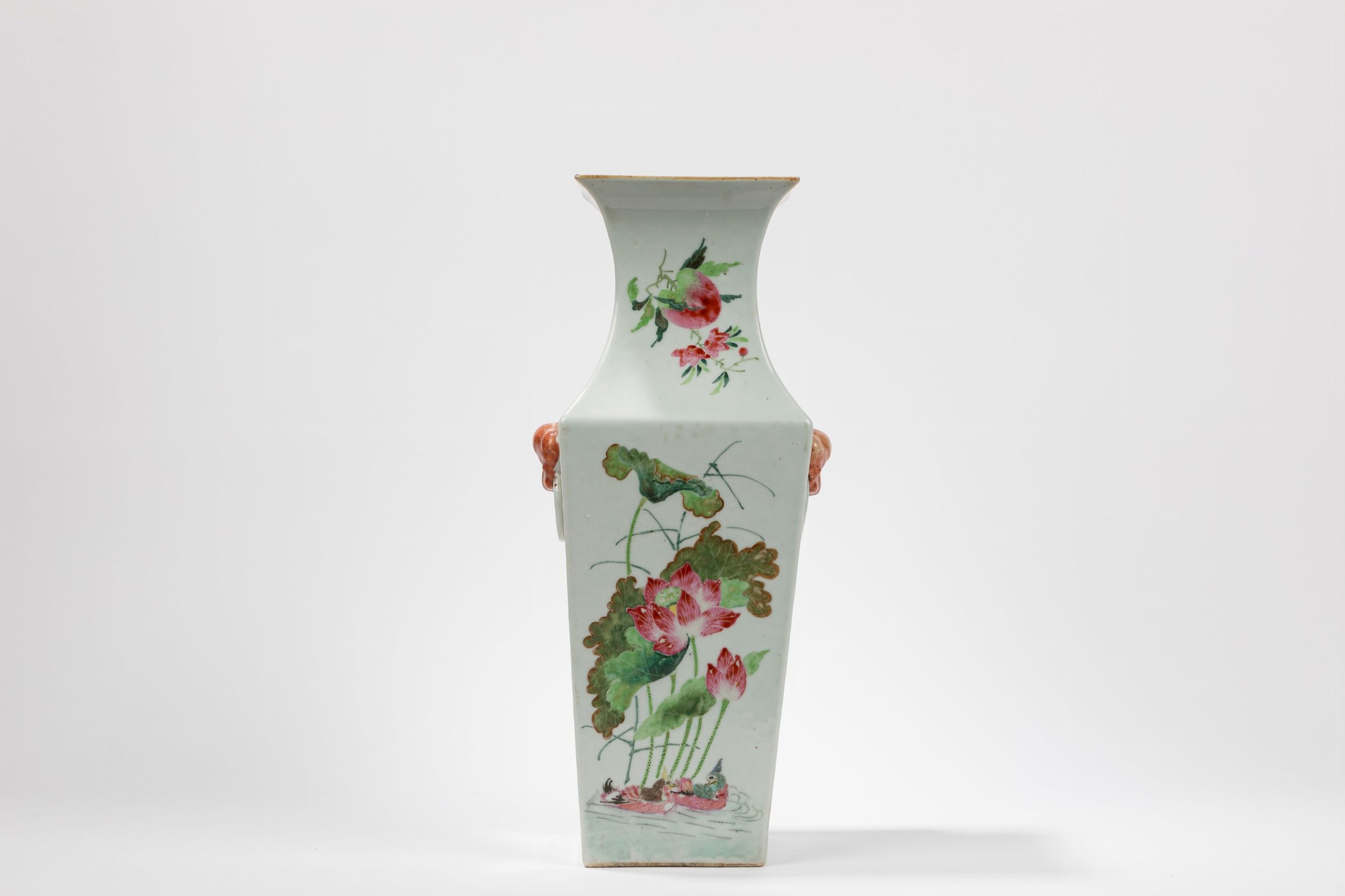 Cina, Repubblica di Cina (1912-1949) Di sezione quadrata con anse a forma di testa di leone con anelli in bocca, è decorato con figure, fiori e uccelli.