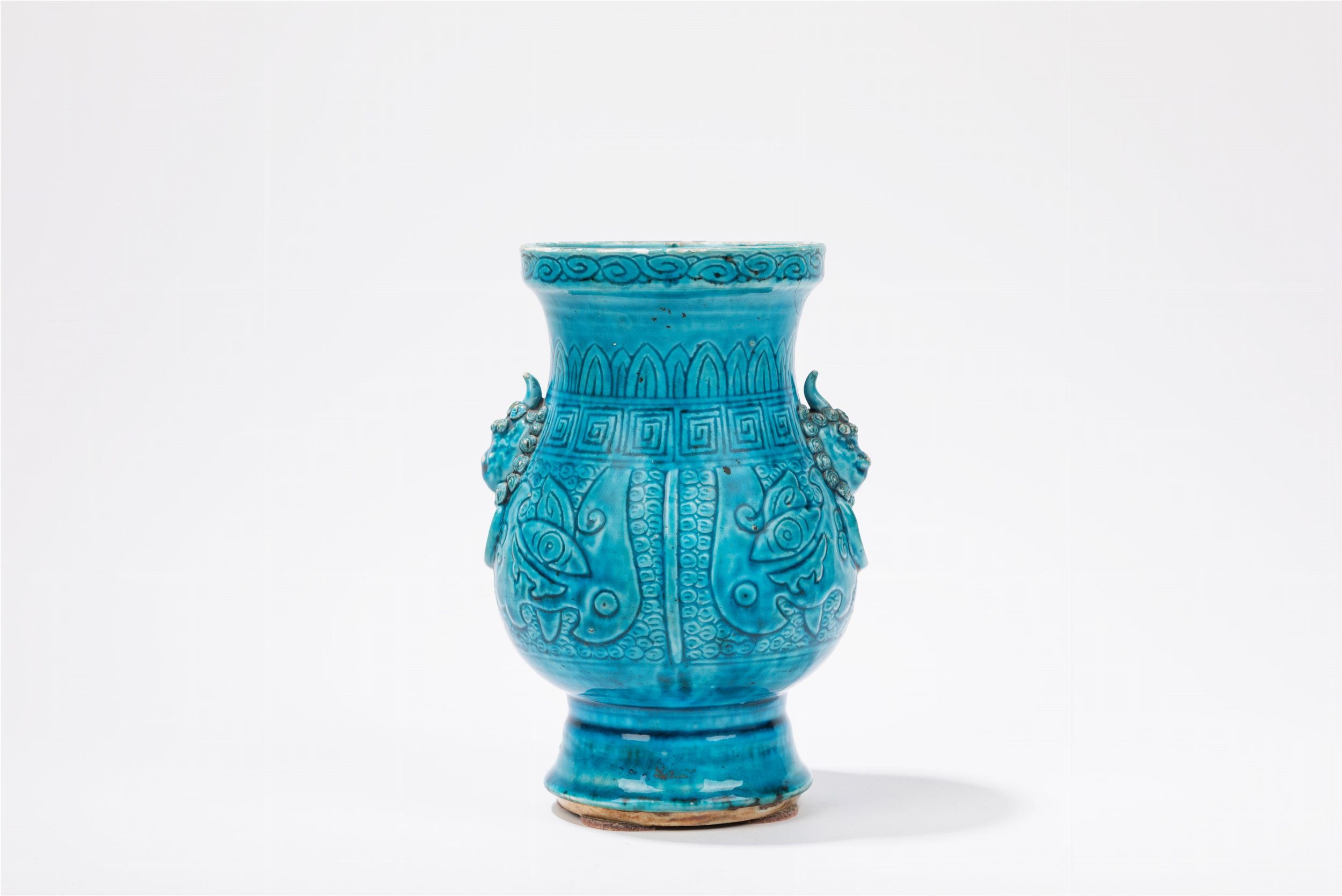 h cm 18,7 Cina, periodo Kangxi (1661-1722) Dalla classica forma con piede rialzato e scampanato, corpo piriforme, sul quale sono presenti due anse a forma di leone che tiene in bocca un anello, che si restringe fino alla bocca svasata, è ben inciso su tutto il corpo con maschere taotie e motivi arcaistici; è completamente ricoperto da un bello smalto turchese intenso, reca sulla base l'etichetta di Antichità Perotto.Provenienza: comprato da una collezione privata italiana da Antichità Perotto a Milano negli anni '80.