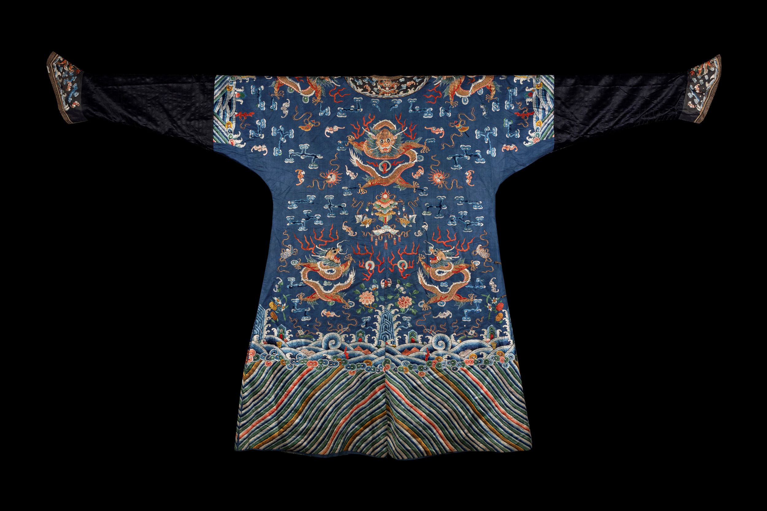 h cm 145 x l cm 237 Cina, dinastia Qing, fine XIX secolo Su fondo blu, è ricamato con nove draghi a cinque artigli a filo d'oro, tra nuvole, pipistrelli, fiori e bajixian e onde; la fascia e i polsini sono anch'essi decorati con draghi, nuvole e pipistrelli.