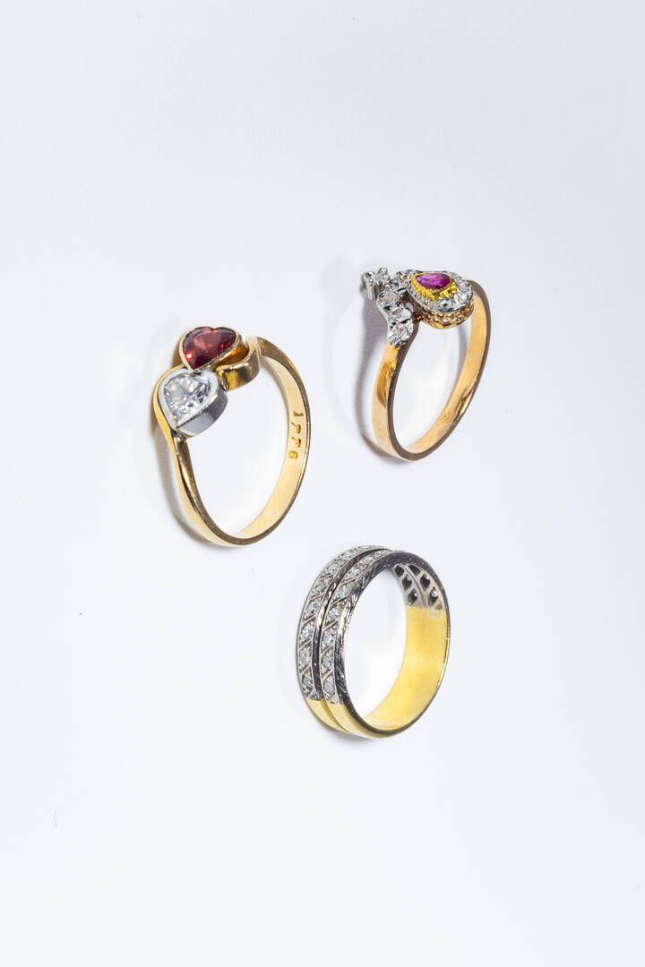-in oro giallo e bianco a bassa caratura con due file di zirconi. Peso gr 4 7. Misura 14 (54) -in oro giallo con due gemme sintetiche. Peso gr 2 9. Misura 16 (56) -in oro giallo e bianco con rubino taglio a goccia e rosette per totali ct 0 15 (una mancante). Peso gr 3. Misura 17 (57)