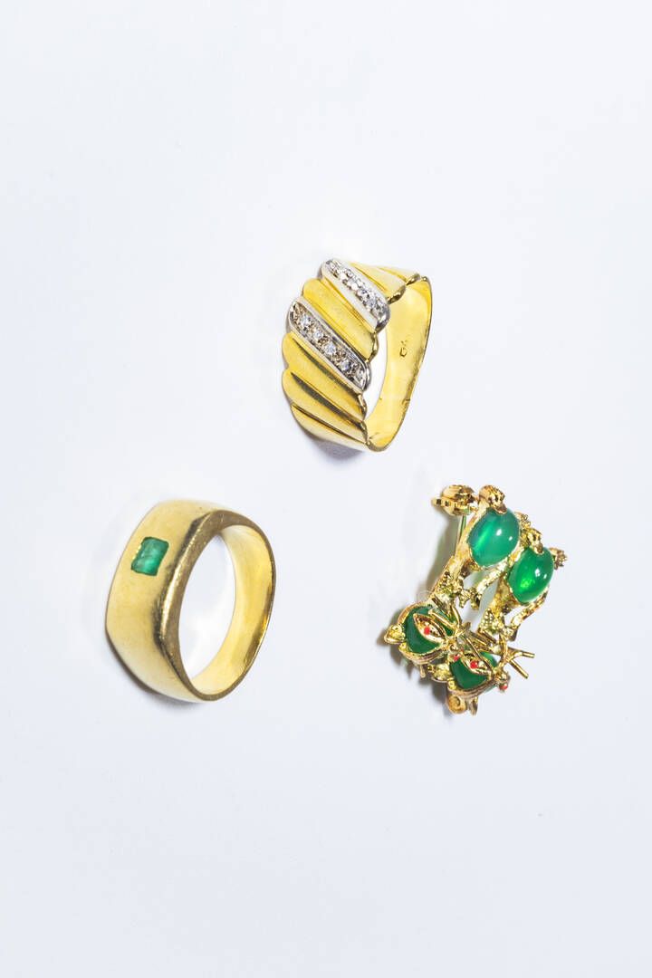 - spilla in oro giallo a forma di gatti con agata verde cabochon. Peso gr 4 6 -anello in oro giallo sommità piatta con smeraldo centrale. Peso gr 6 4. Misura 10 (50) -anello in oro giallo sommità lavorata con due file in oro bianco con diamantini 8/8 per totali ct 0 10 ca. Peso gr 5 2. Misura 10 (50)