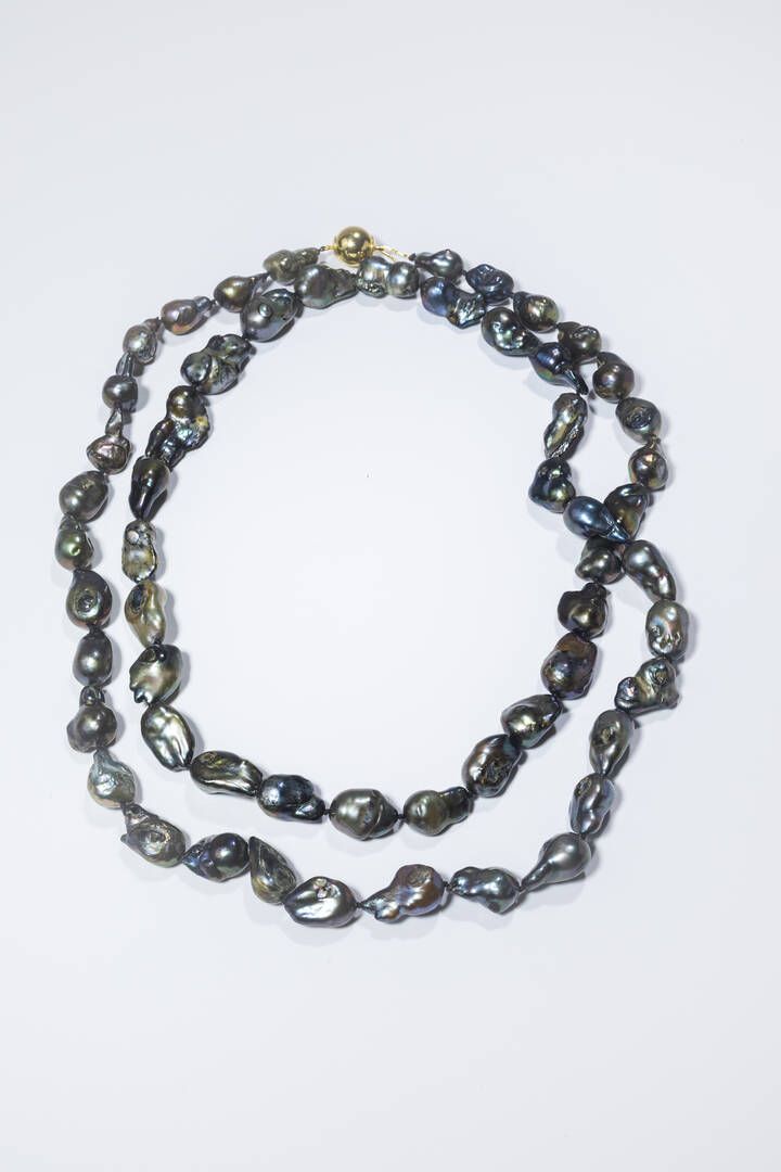 Lunghezza 120 cm composta da un filo di perle di acqua dolce scaramazze tinte nei toni del grigio. Chiusura a sfera in argento dorato.