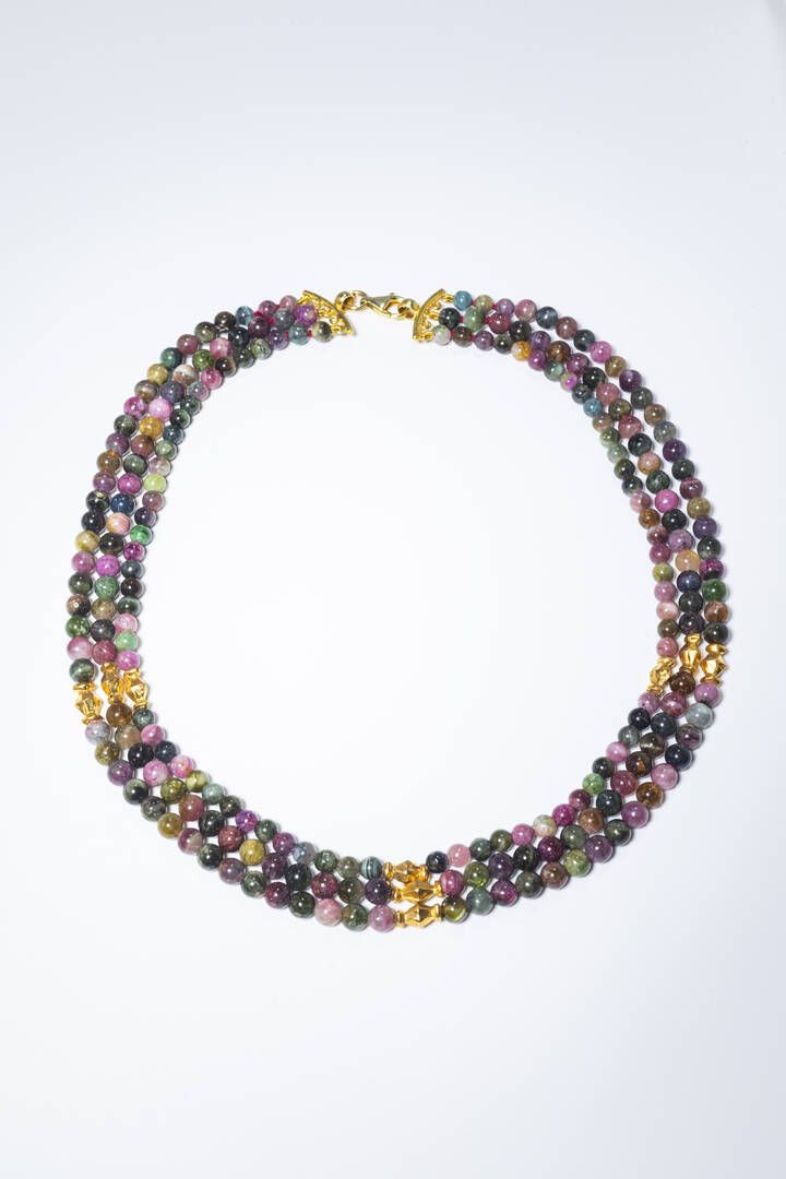 Lunghezza cm 44 composto da tre fili di tormaline nei toni del verde del viola e del rosa. Chiusura e distanziali in argento dorato.