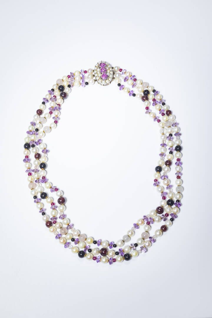 Lunghezza cm 44 composto da tre fili perline giapponesi del diam. di mm 5 5-6 ca alternati a dischi di ametiste e granati. Chiusura in oro bianco con rubini e perline.