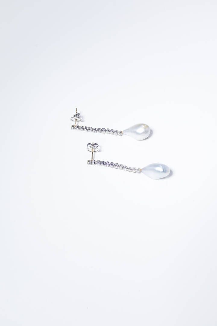Lunghezza cm 5 5 pendenti corpo in oro bianco con diamantini taglio brillante per totali ct 0 30 ca terminanti con due perle Tahiti scaramazze nei toni del grigio.