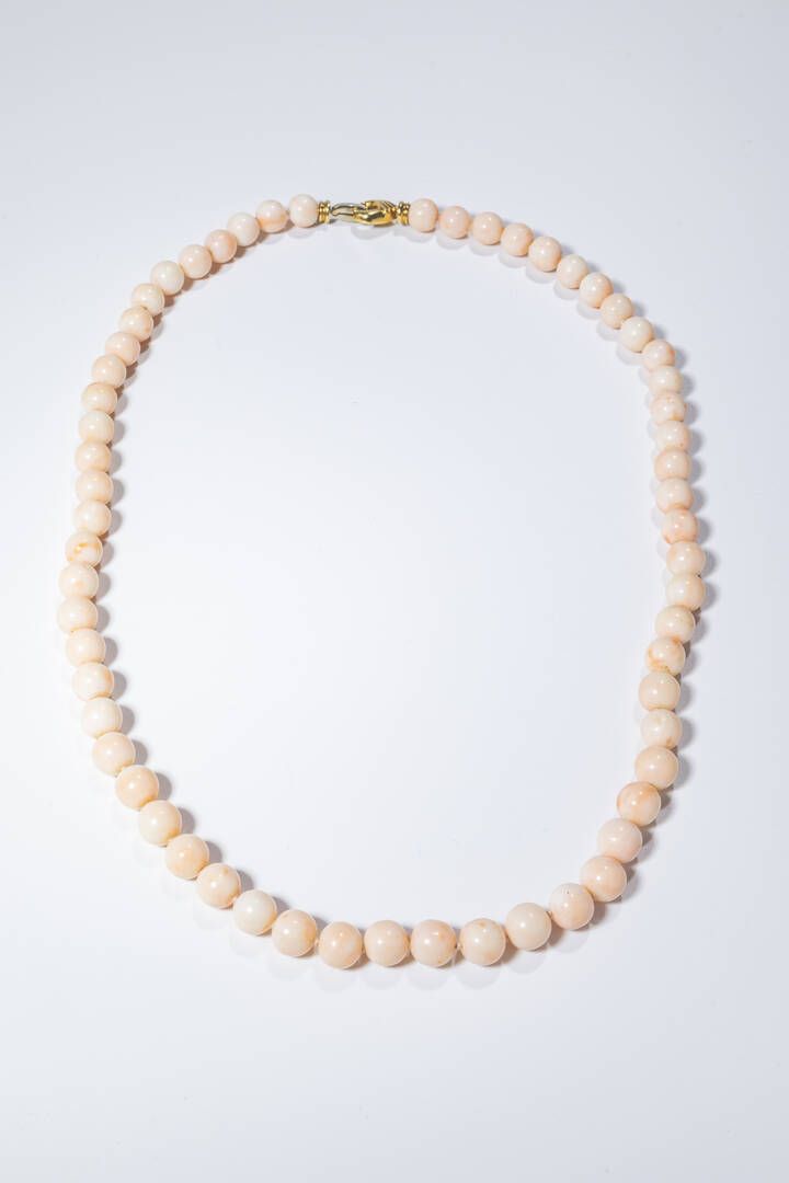 Lunghezza cm 67 Peso gr 102 composto da sfere di corallo rosa del diam. di mm 10 ca. Chiusura in oro giallo a moschettone Accompagnato da certificato telematico di autenticità Ce.S.Ar. Centro Studi Archeometrici.