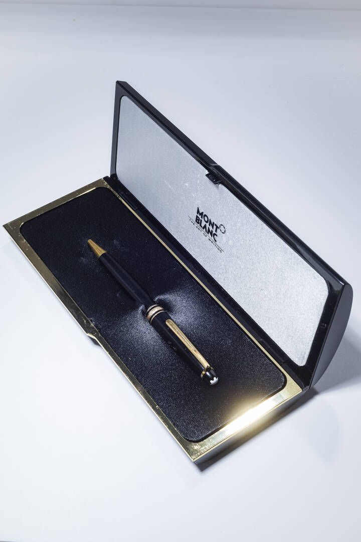 Penna a sfera Montblanc. Cappuccio con logo della maison e corpo in resina nera. Finiture color oro giallo. Corredata di scatola.