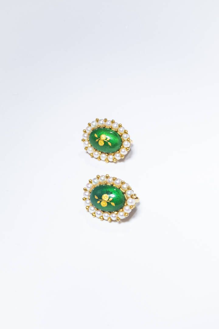 Peso gr 10 1 in oro giallo a clip di forma ovale con smalto centrale nei toni del verde e decoro con fiore; contornati da piccole perline.