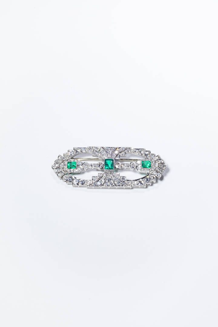 Peso gr 10 4 Cm 2x5 in oro bianco di forma rettangolare con angoli arrotondati; diamanti taglio16/16 brillante e 8/8 per totali ct 1 60 ca e tre smeraldi taglio ottagonale e gradini per totali ct 1 0 ca.