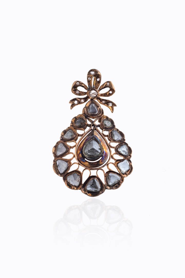 Peso gr 10 4 cm 5.5x3 in oro rosa a bassa caratura XIX secolo con fiocco trattenente goccia in rosette di diamanti per totali ct 3 80 ca.