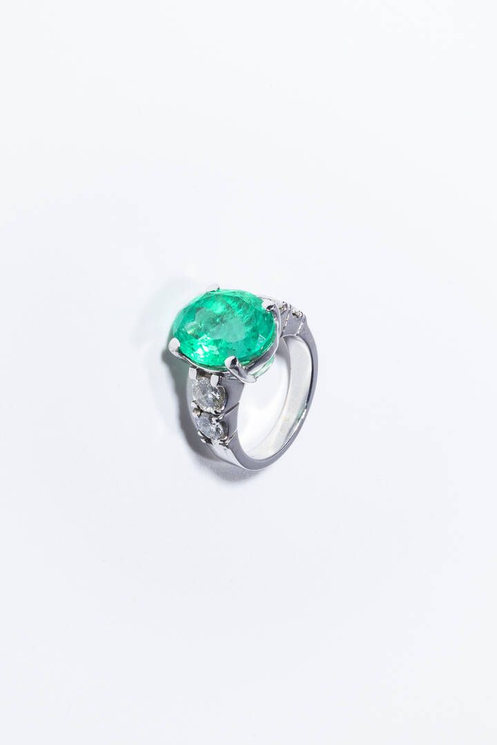 Peso gr 10.9 Misura 14 (54) in oro bianco al centro smeraldo colombiano taglio ovale di ct 8 10 ed ai lati quattro diamanti taglio brillante per totali ct 1 10 ca. Certificato di analisi del Dottor Pio Visconti n. C29067in data Marzo 2019.