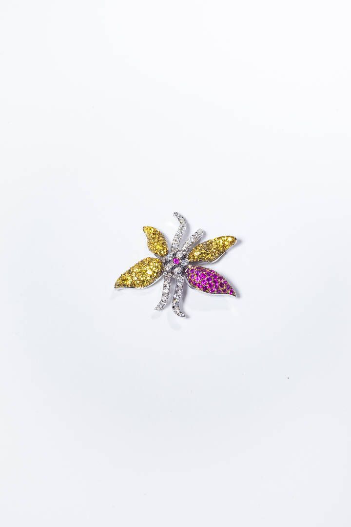 Peso gr 11 0 Cm 3 5x3 5 in oro bianco a forma di fiore con petali in pavé di diamanti taglio brillante per totali ct 0 25 ca rubini taglio rotondo per totali ct 0 80 ca e zaffiri gialli per totali ct 2 50 ca.