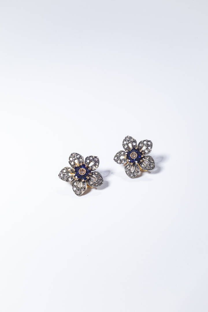 Peso gr 11 1 a lobo in oro rosa 14 Kt ed argento a forma di fiore con zaffiri taglio rotondo per totali ct 0 80 ca e rosette di diamanti per totali ct 0 75 ca.