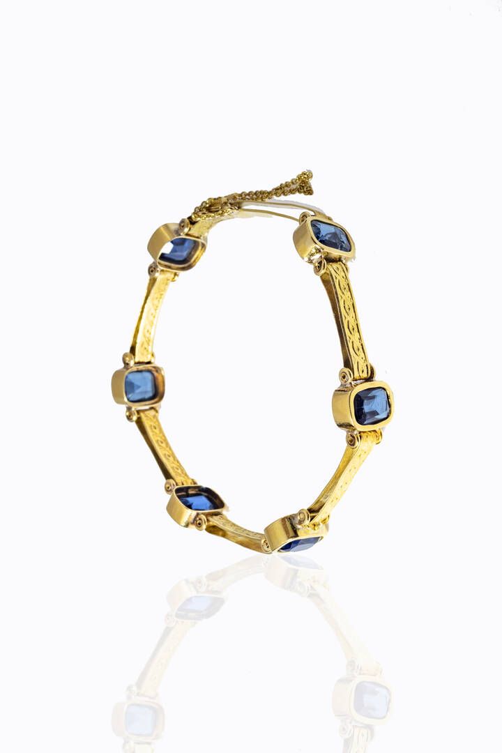 Peso gr 11 2 in oro giallo XIX secolo composto da segmenti rigidi incisi alternati a zaffiri sintetici.