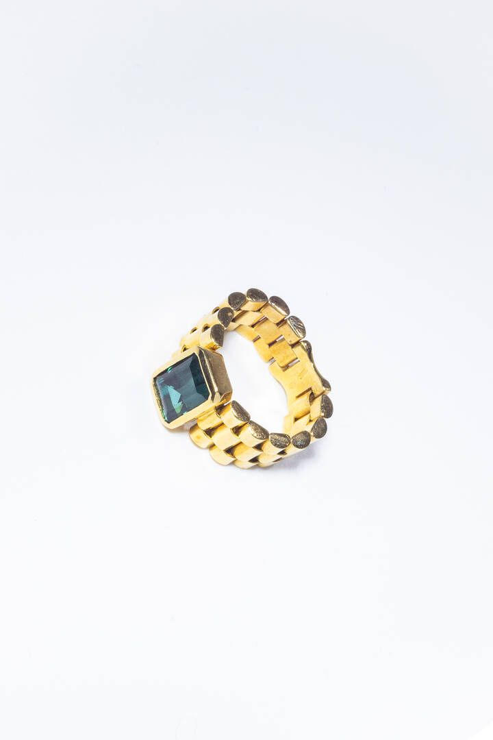 Peso gr 11 2 Misura 14 (54) in oro giallo gambo a maglia geometrica morbida al centro tormalina verde taglio ottagonale.
