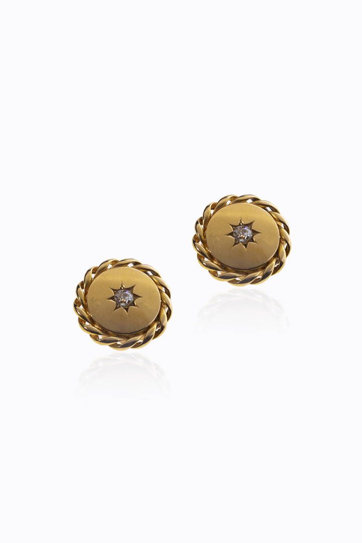 Peso gr 11 7 in oro giallo a clip di forma rotonda con bordo lavorato a torchon; al centro due diamanti taglio brillante di vecchio taglio per totali ct 0 20 ca.