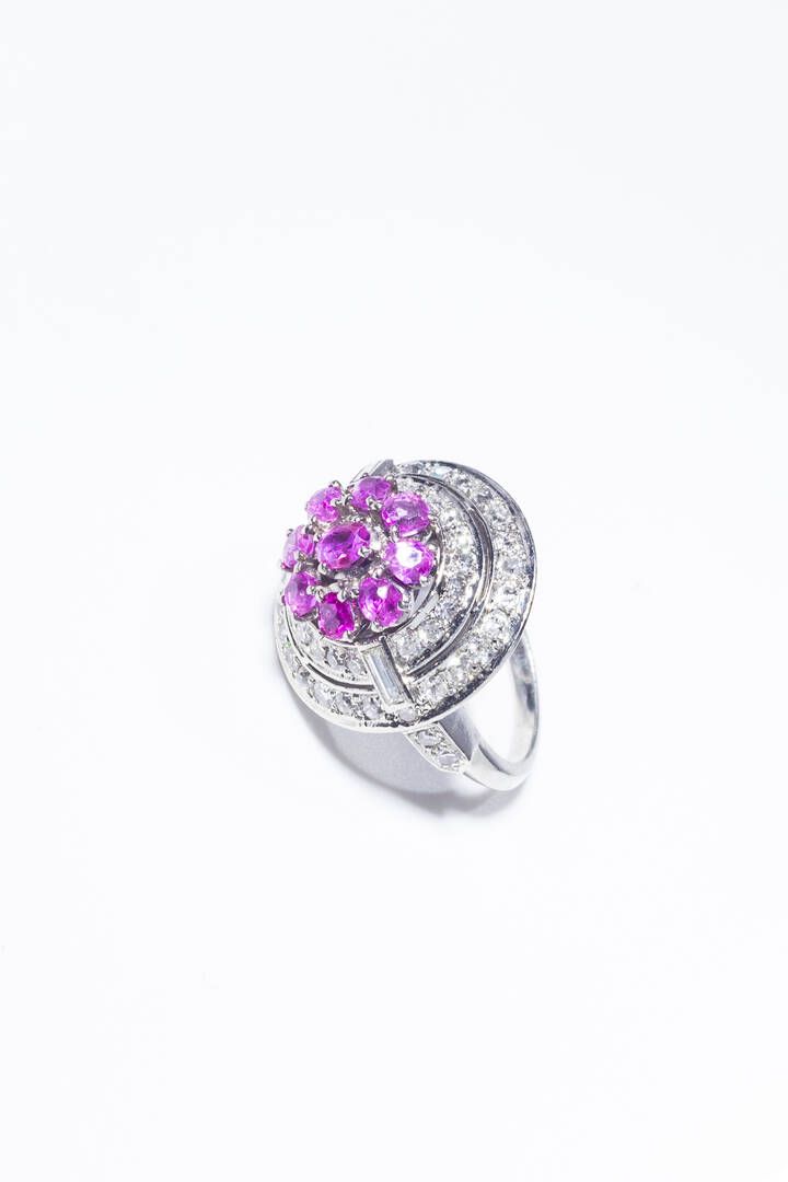 Peso gr 11 7 Misura 12 (52) in platino anni '40 sommità rotonda con rubini taglio rotondo per totali ct 1 30 ca e doppio contorno di diamanti taglio 8/8 e baguette per totali ct 1 70 ca