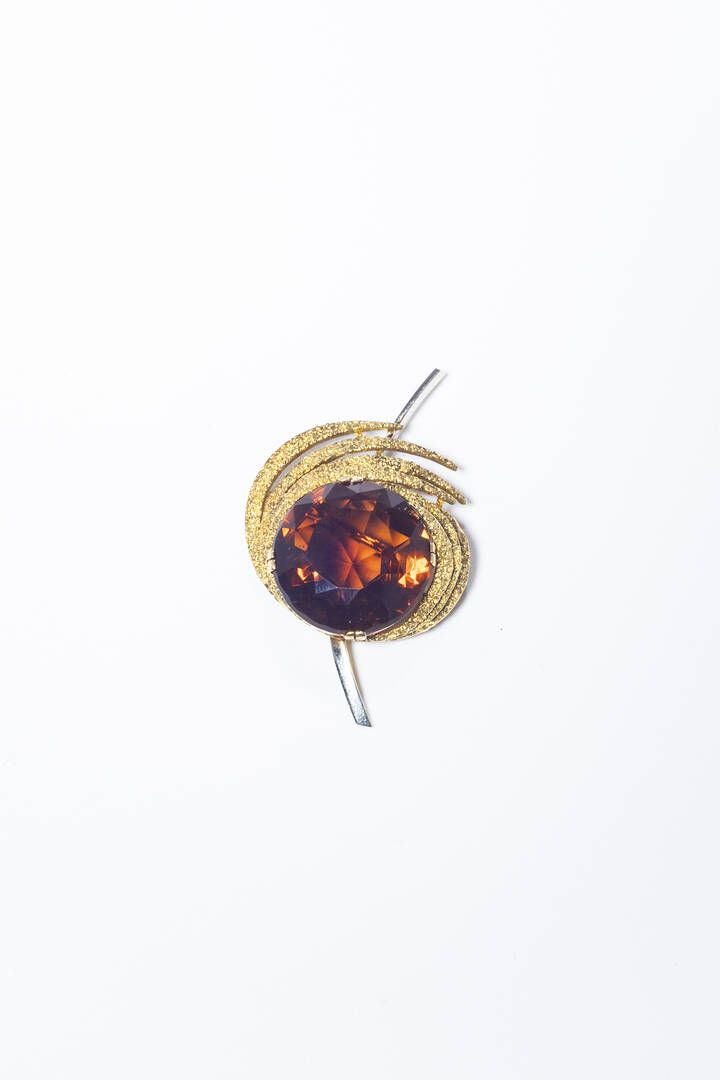 Peso gr 11 8 Cm 2 5x5 in oro giallo 14 Kt con citrino al centro; incorniciato da piume satinate.