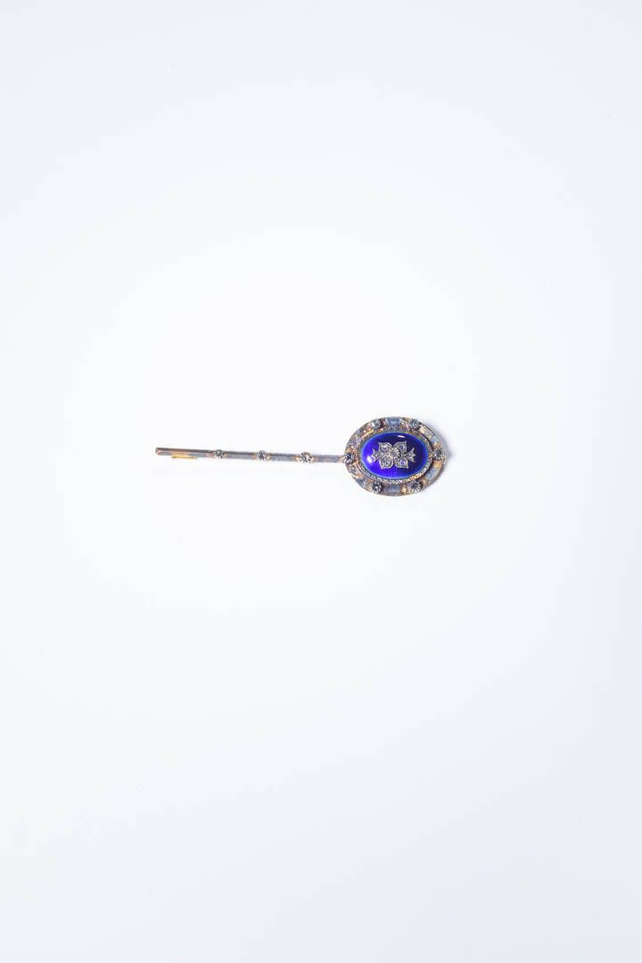 Peso gr 11 8 Lunghezza cm 7 XIX secolo in oro a bassa caratura ed argento a barretta con elemento ovale in smalto blu e rosette di diamanti per totali ct 0 15 ca.
