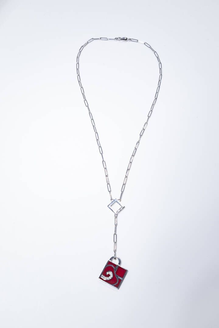 Peso gr 13 5 Collana in oro bianco composta da anelli ovalizzati e ciondolo quadrato a forma di lucchetto in smalto rosso e diamanti taglio brillante per totali ct 0 05 ca siglata N.B.
