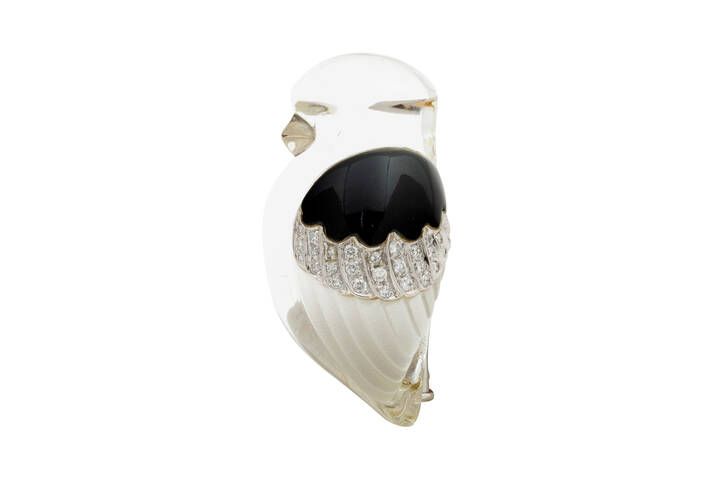 Peso gr 14 2 cm 3 5x1 5 in oro bianco a forma di pettirosso con corpo in cristallo di rocca inserto in onice e diamanti taglio brillante per totali ct 0 20 ca.