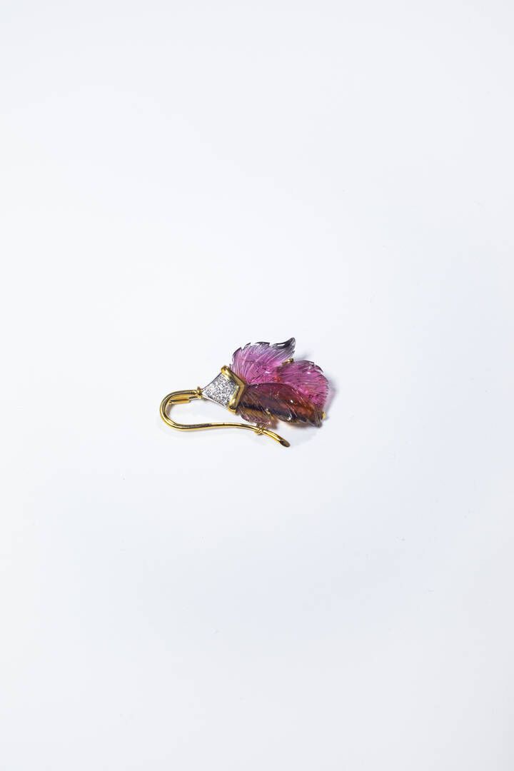Peso gr 14 3 Cm 3x5 in oro giallo e bianco con foglia in tormalina policroma incisa; diamanti taglio brillante per totali ct 0 15 ca.