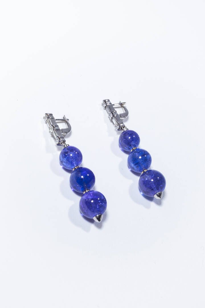 Peso gr 15 3 pendenti in oro bianco con grandi sfere di tanzanite dal diam di mm 9 a 11 per totali ct 57 60. Diamanti taglio brillante e baguette per totali ct 0 40 ca.