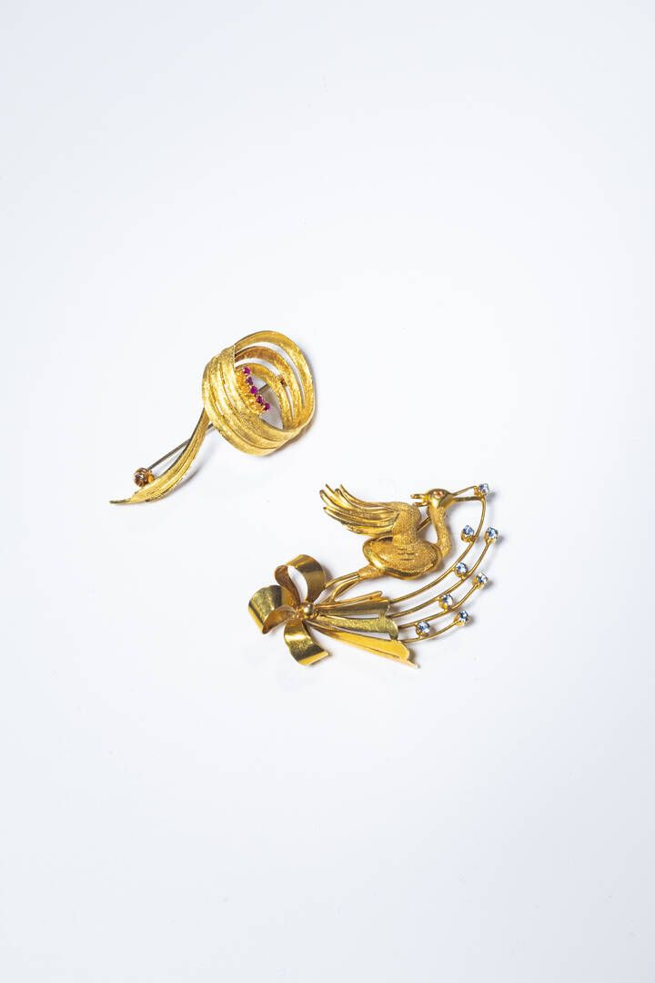 Peso gr 15 5 Cm 2x4 5 e 3 5x5 in oro giallo anni '50 una a forma di voluta con rubini e una forma di uccello con gemme sintetiche a decoro.