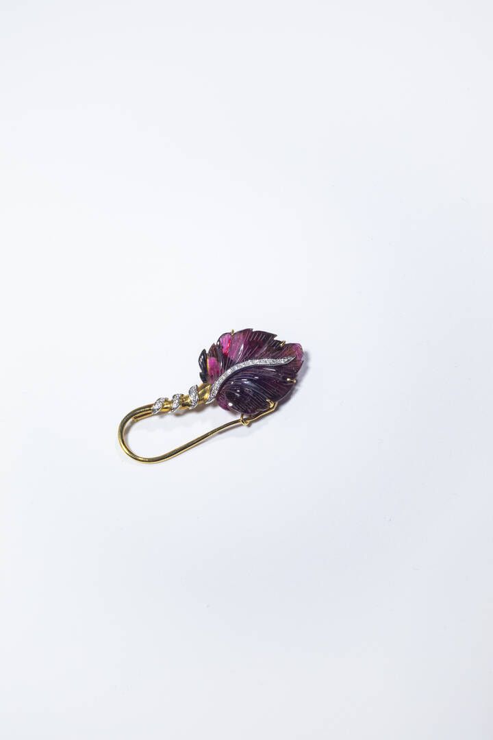 Peso gr 15 5 Cm 6 5x3 in oro giallo e bianco con foglia in tormalina policroma incisa; diamanti taglio brillante per totali ct 0 25 ca.