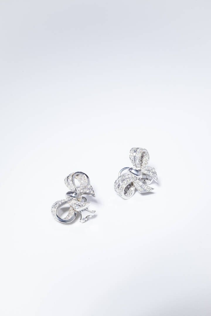 Peso gr 15 in oro bianco a lobo con due grandi fiocchi in diamanti taglio brillante per totali ct 1 25 ca probabile colore G-H purezza IF-VVS.