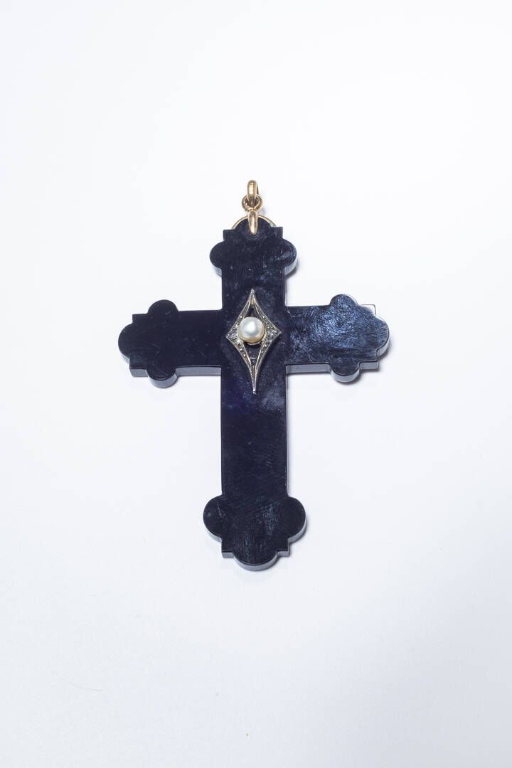 Peso gr 16 1 Cm 7x5 XIX secolo a forma di croce in onice; gancio in oro; al centro decoro con perlina e rosette.