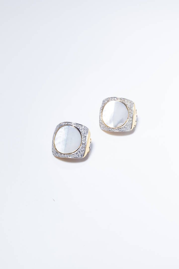 Peso gr 16 3 in oro bianco e giallo di forma geometrica ricurva con al centro madreperla briolette e diamanti taglio brillante per totali ct 0 98 ca colore G. purezza IF-VVS.