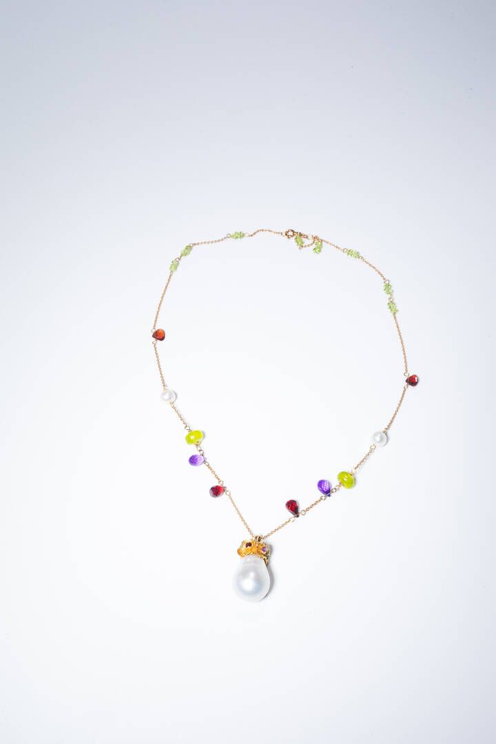 Peso gr 16 4 in oro rosa e giallo con perla australiana scaramazza del diam. di mm 15 ca; catena decorata con perle di acqua dolce; ametiste granati e olivine cabochon e a goccia.