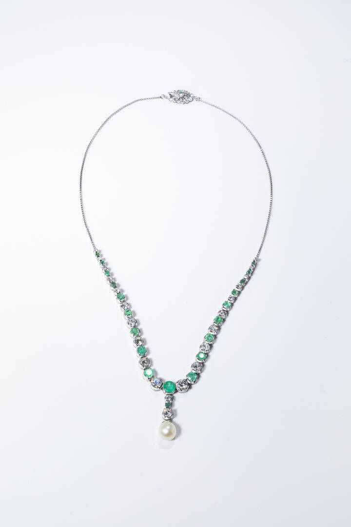 Peso gr 16 7 in oro bianco al centro fila di diamanti taglio brillante e 8/8 per totali ct 2 10 ca alternati a smeraldi taglio rotondo per totali ct 3 0 ca; terminante con perla pendente del diam. di mm 8 ca.