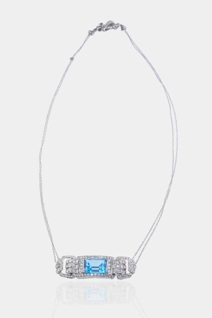 Peso gr 18 3 Lunghezza cm 43 in oro bianco con al centro pendente rigido con topazio azzurro e diamanti taglio brillante per totali ct 1 30 ca.